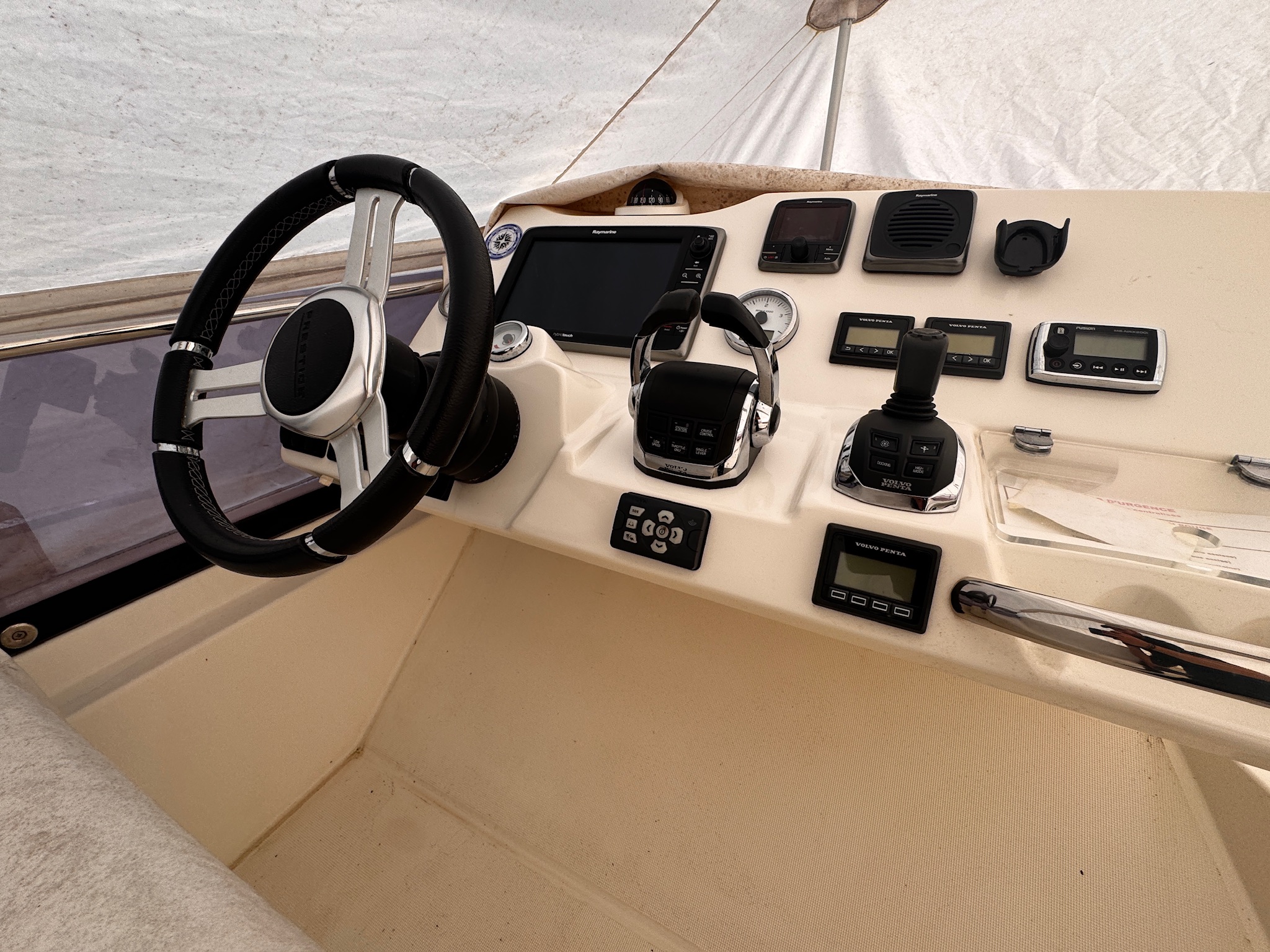 For sale: 2016 Prestige 500 Fly, powered by two Volvo IPS 600s (2x D6-435 hp) with joysticks, offering exceptional maneuverability. This yacht stands out for its amenities. It features premium finishes including a hydraulic platform (300 kg load), a 100L/h watermaker, powerful 49,000 BTU air conditioning, and a complete Raymarine electronics system (GPS, radar, autopilot, AIS, backup cameras, and engine).