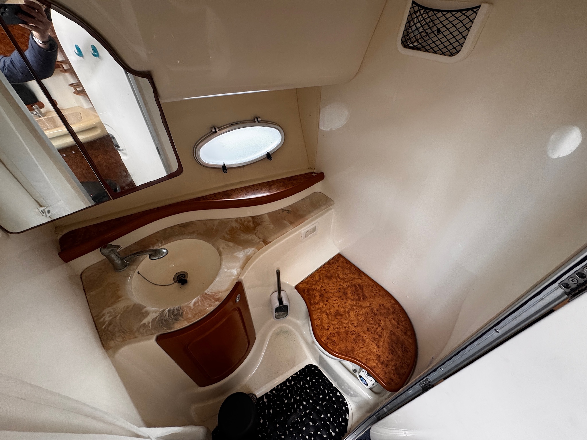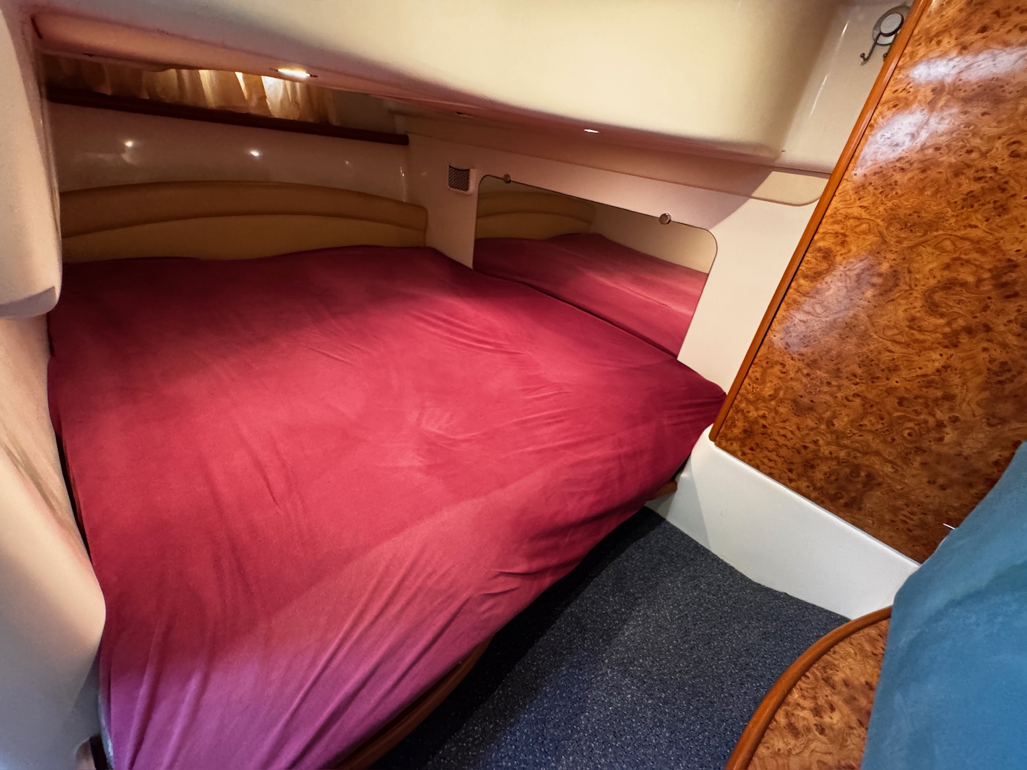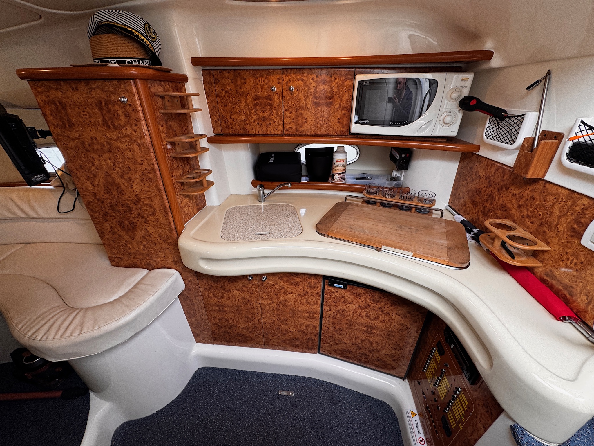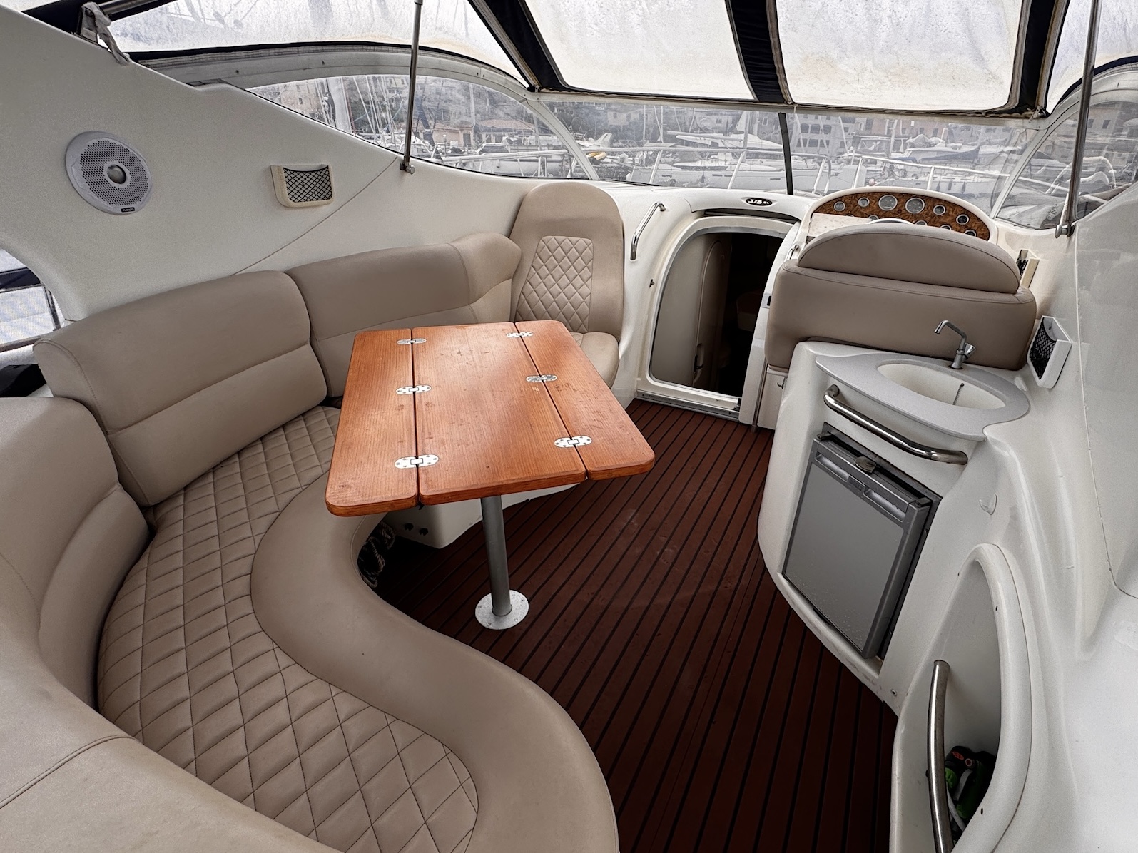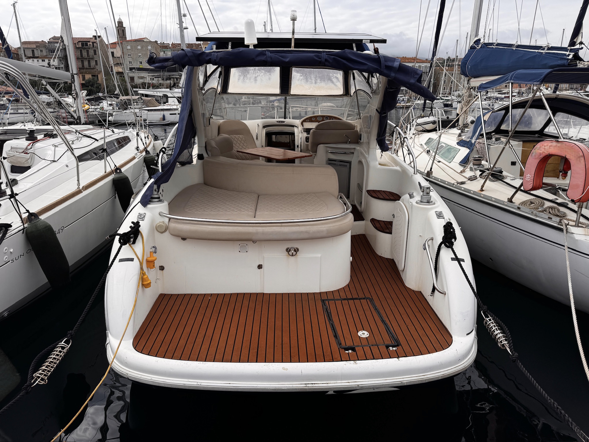Fully equipped for your comfort: dual-control electric windlass, 300W solar panel, Dolphin charger, two new batteries (2022), 220V circuit, two 12/220V transformers, TV, and radio. The interior and exterior leatherette upholstery were redone in 2022 and 2023, ensuring a modern and refined look.