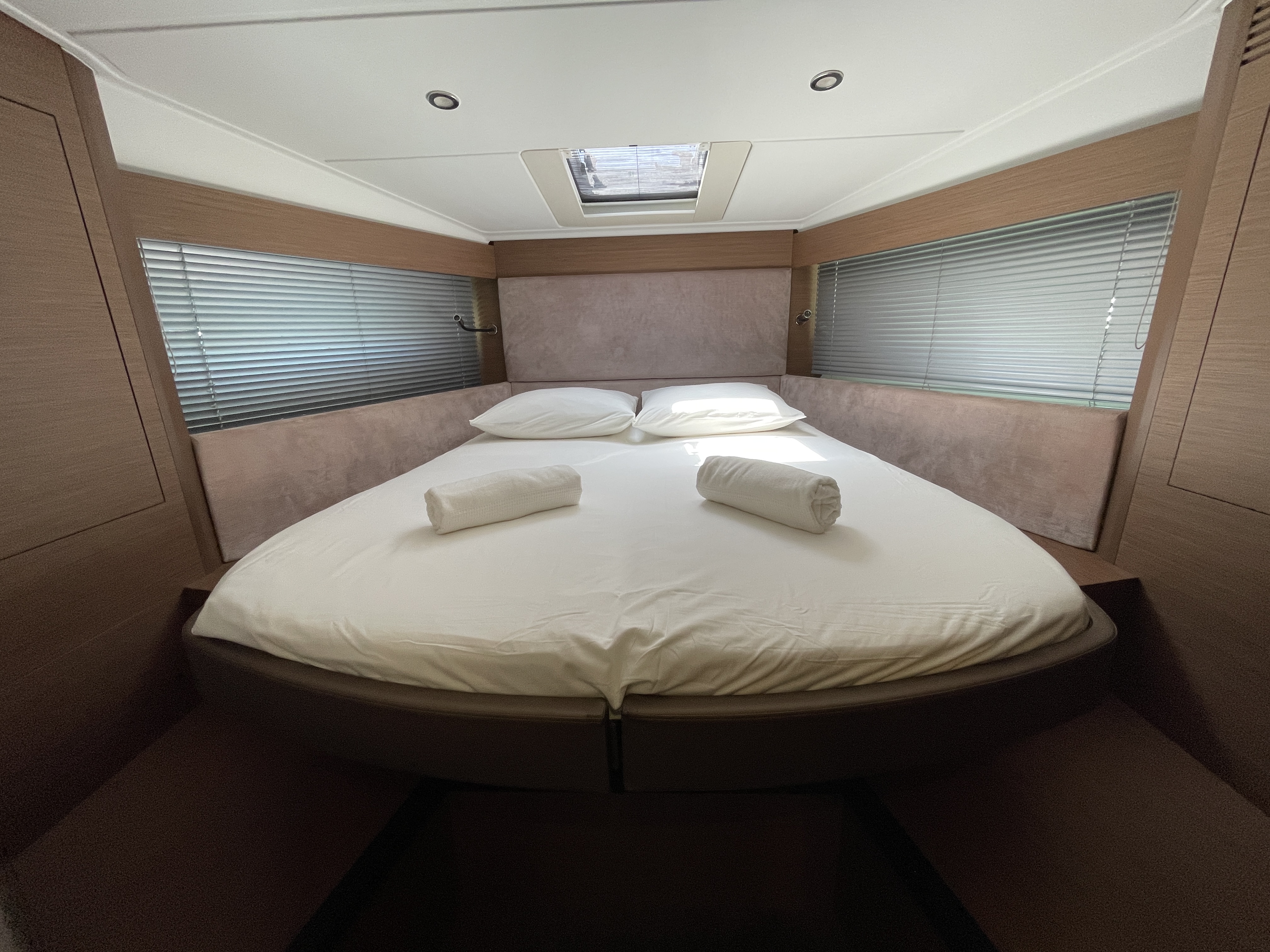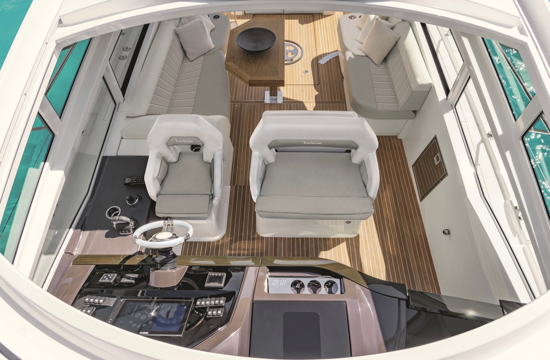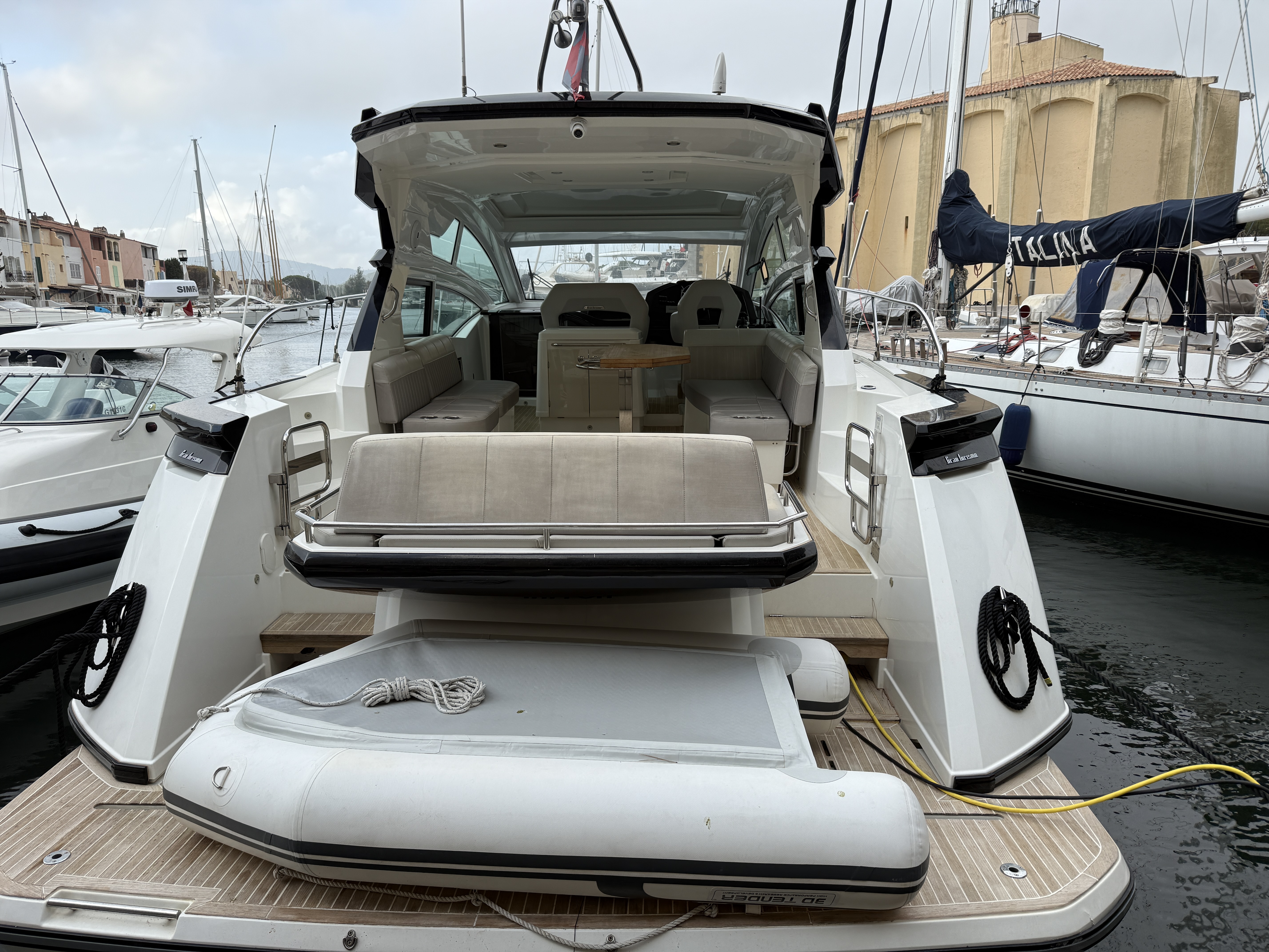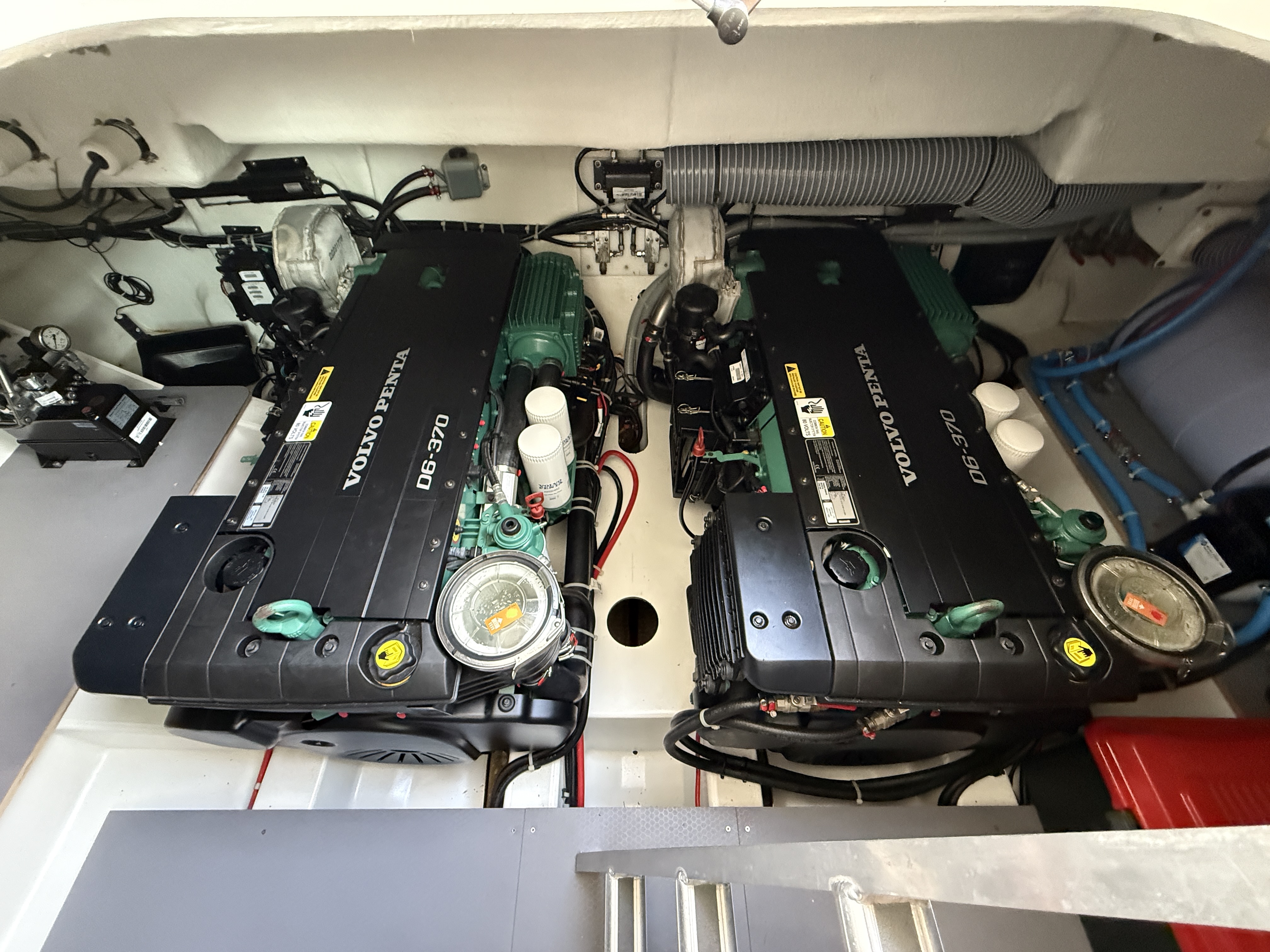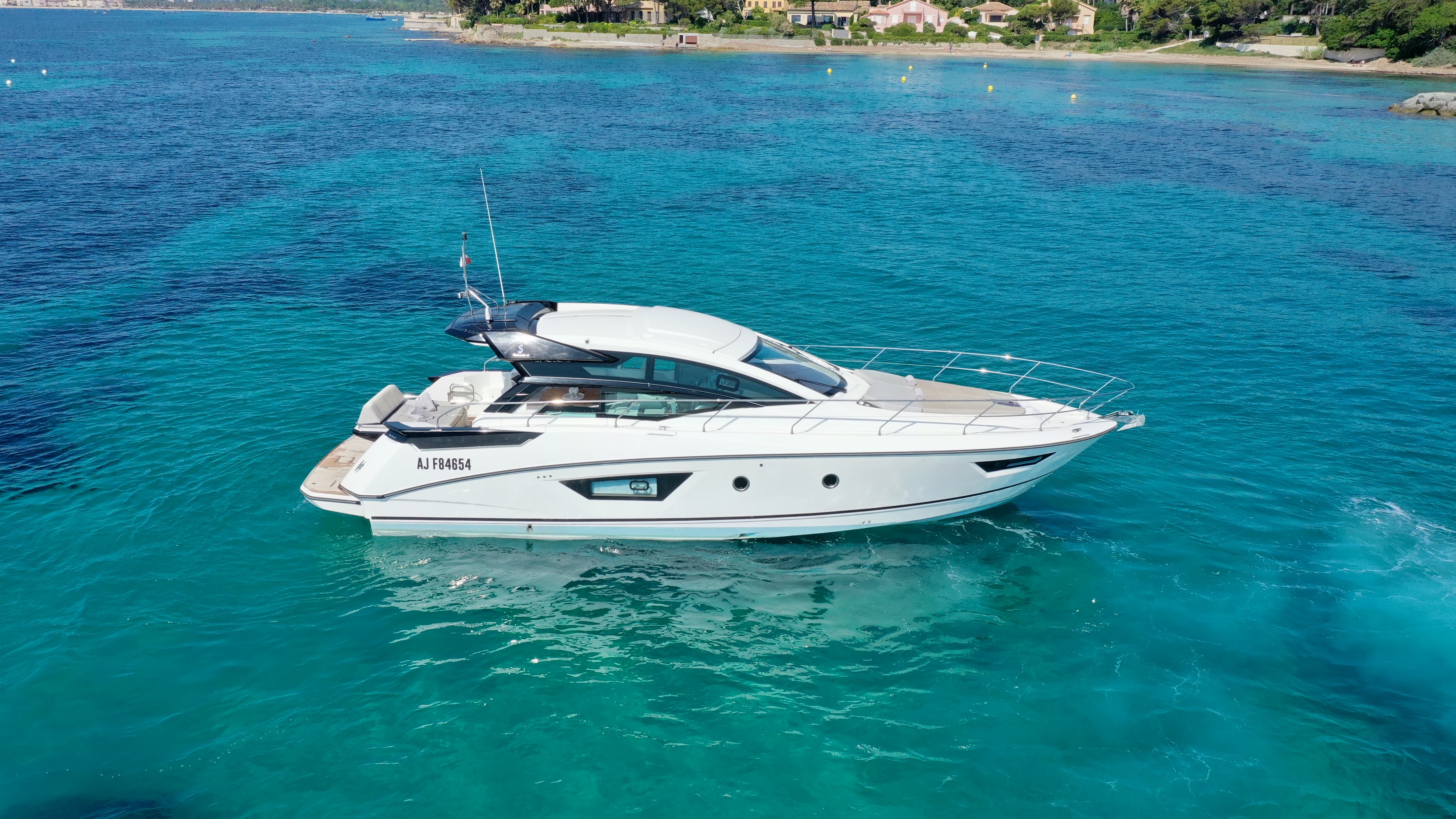 You'll be captivated by its contemporary design and spaciousness. Designed for fast cruising and relaxing in the Mediterranean, it features two Volvo D6-370 hp engines with proven reliability, a hydraulic platform for your watersports, and a teak deck that extends the pleasure at anchor.