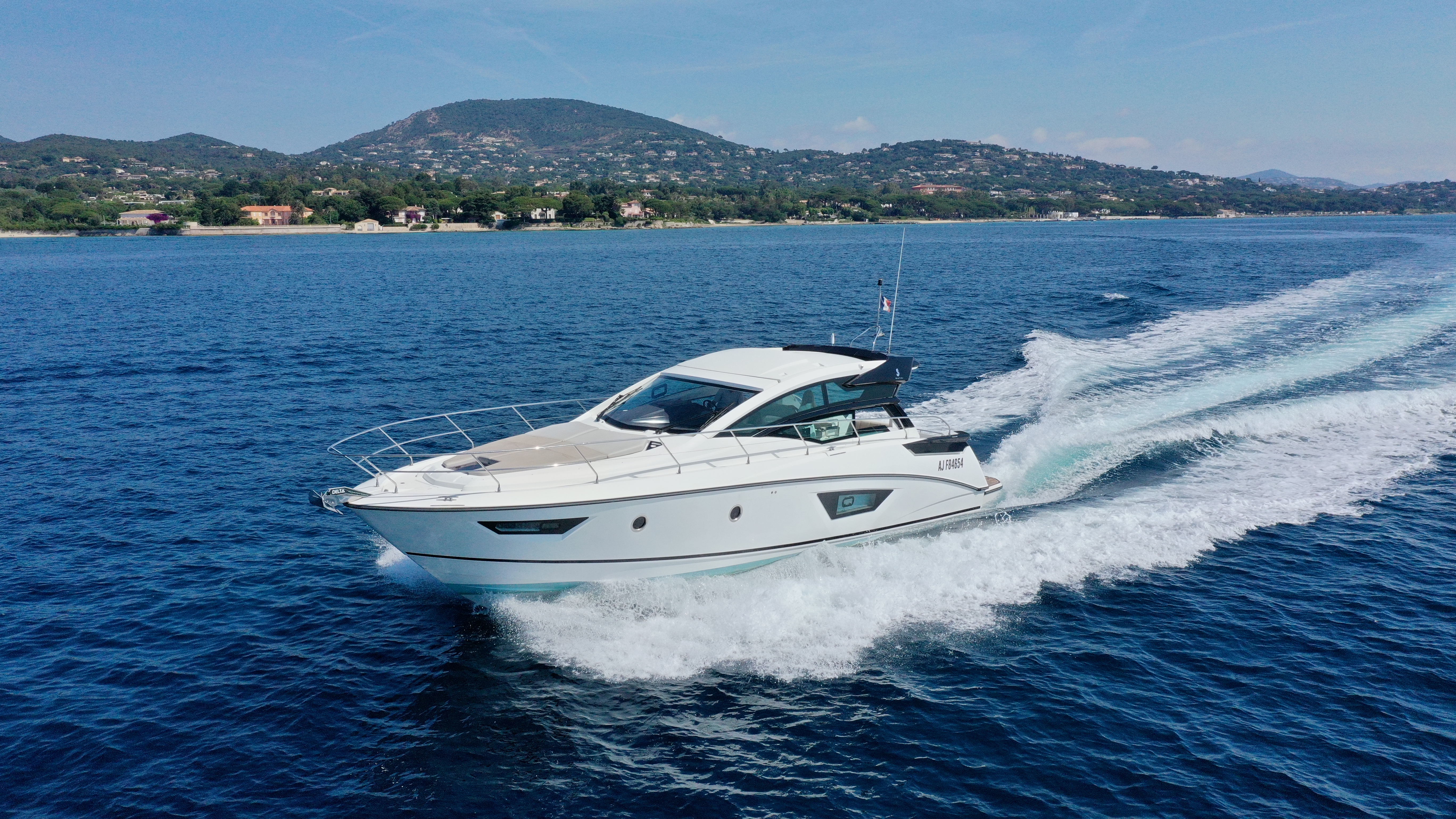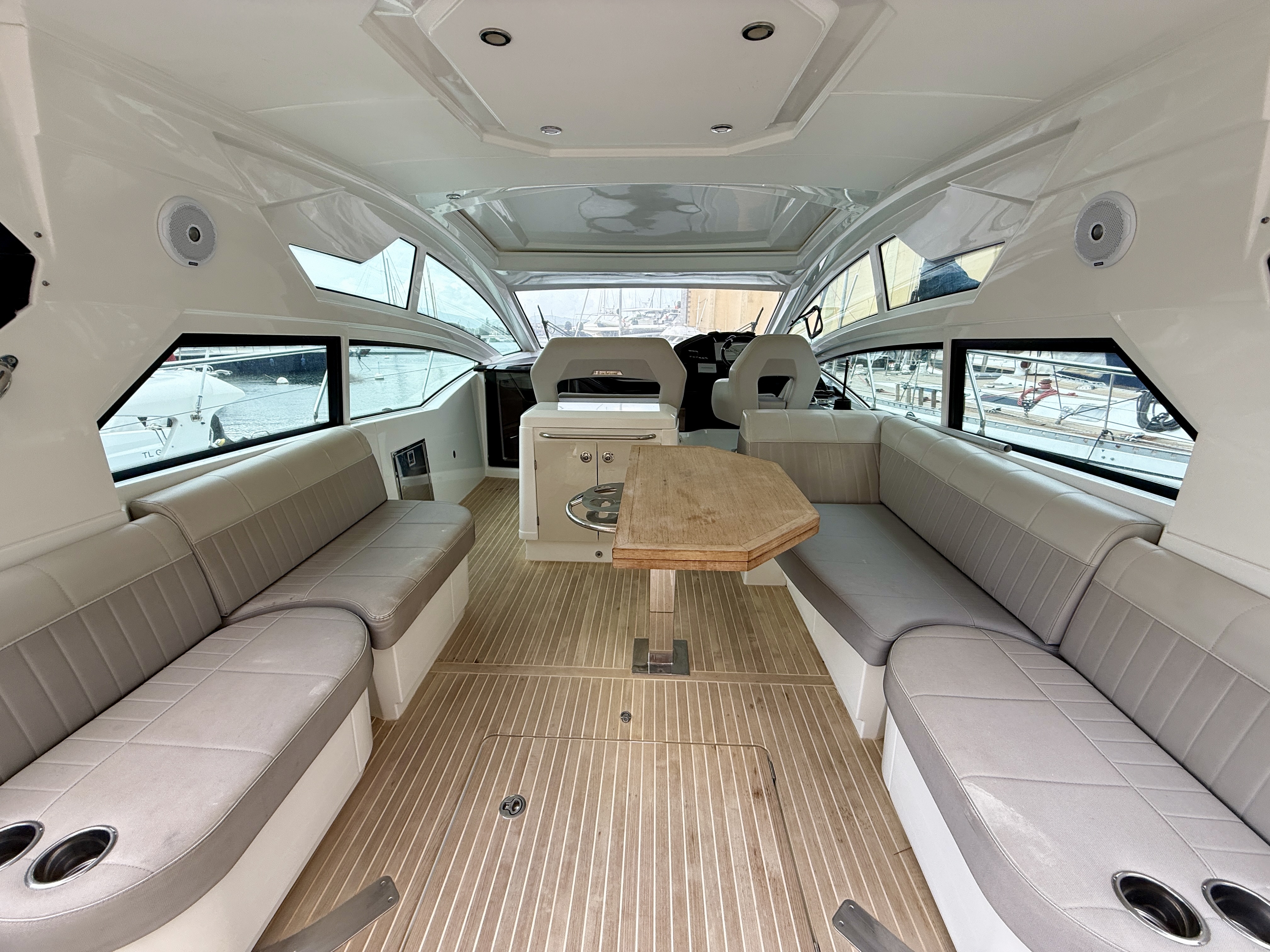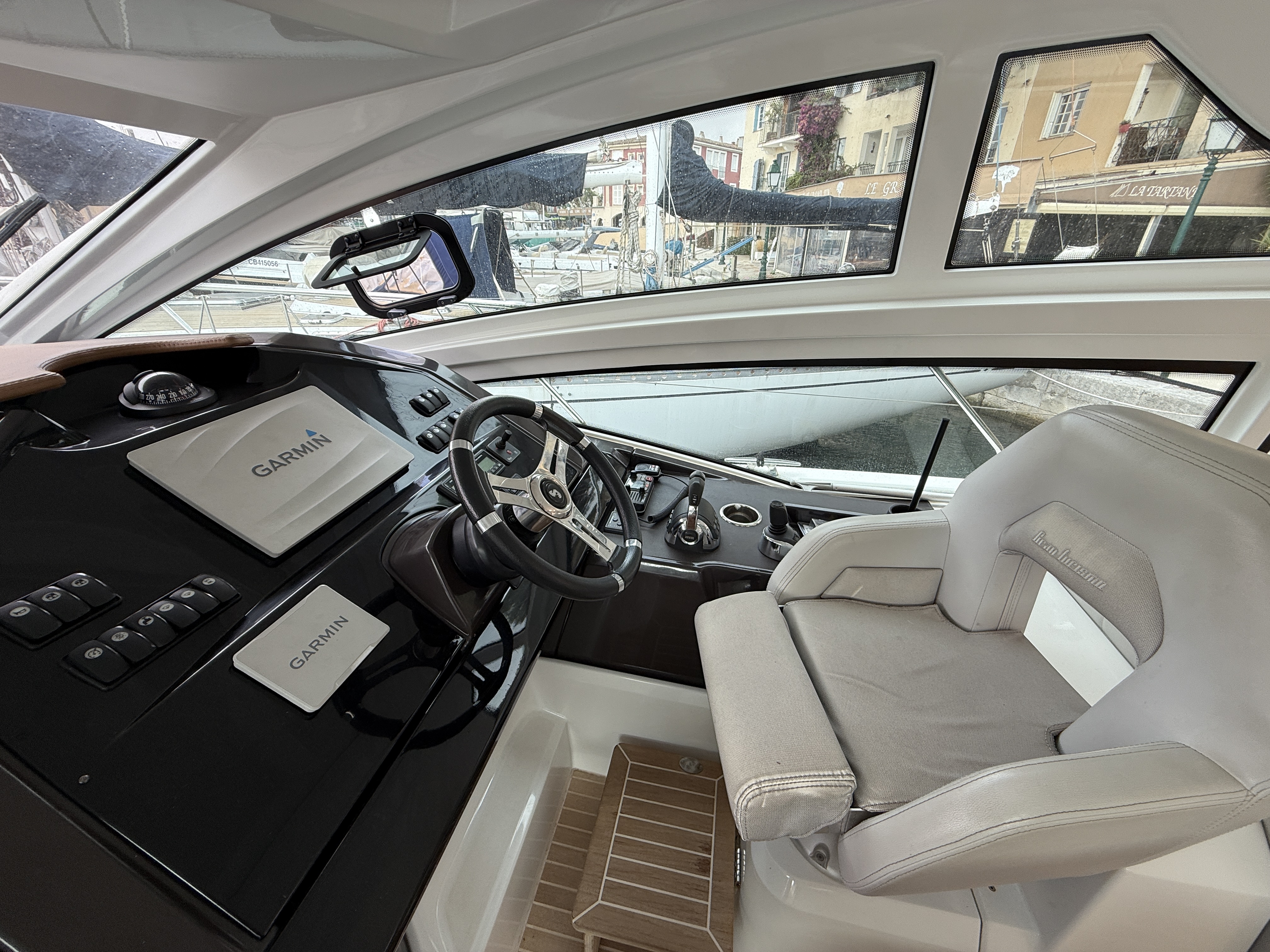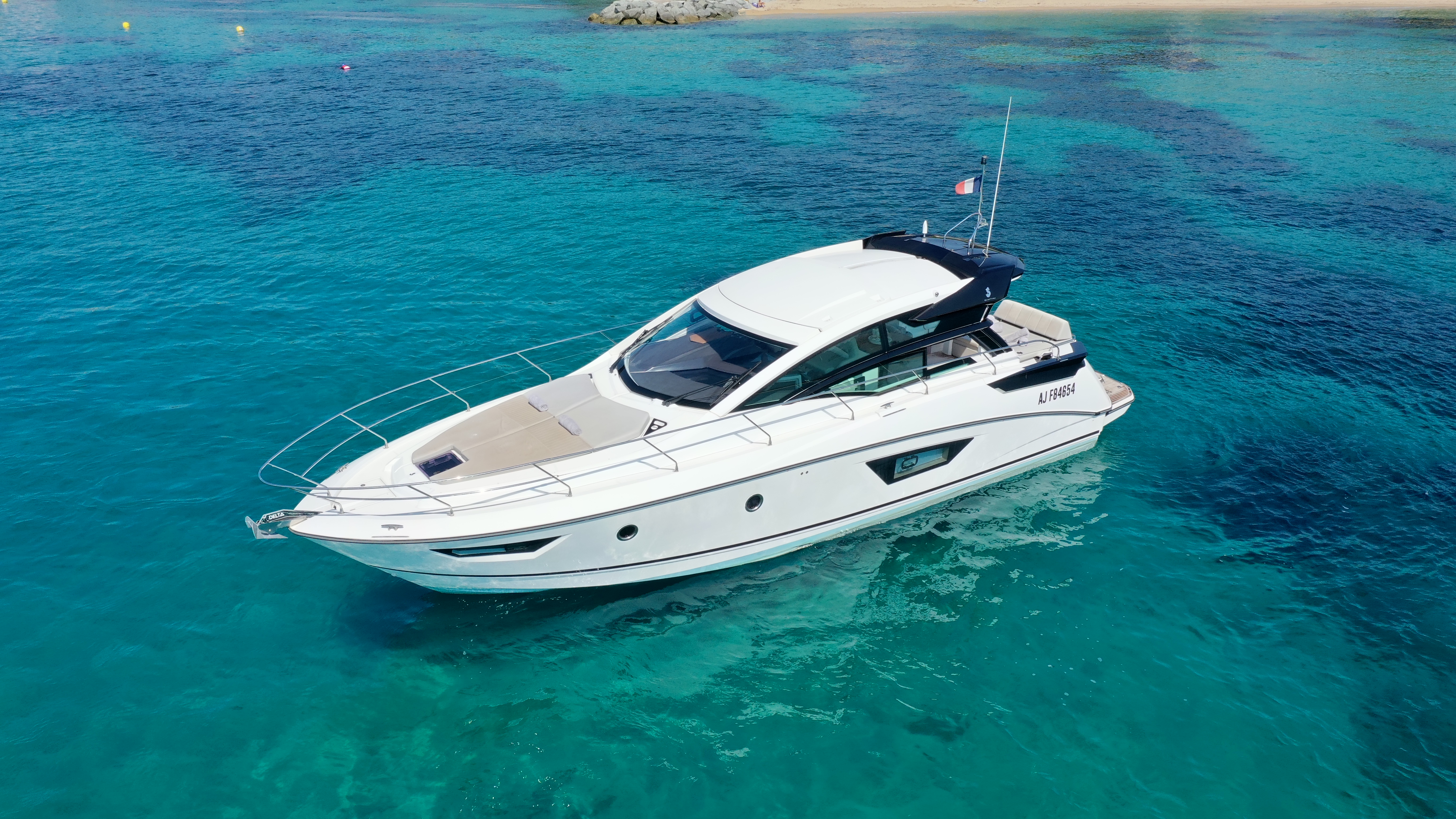 You'll be captivated by its contemporary design and spaciousness. Designed for fast cruising and relaxing in the Mediterranean, it features two Volvo D6-370 hp engines with proven reliability, a hydraulic platform for your watersports, and a teak deck that extends the pleasure at anchor.