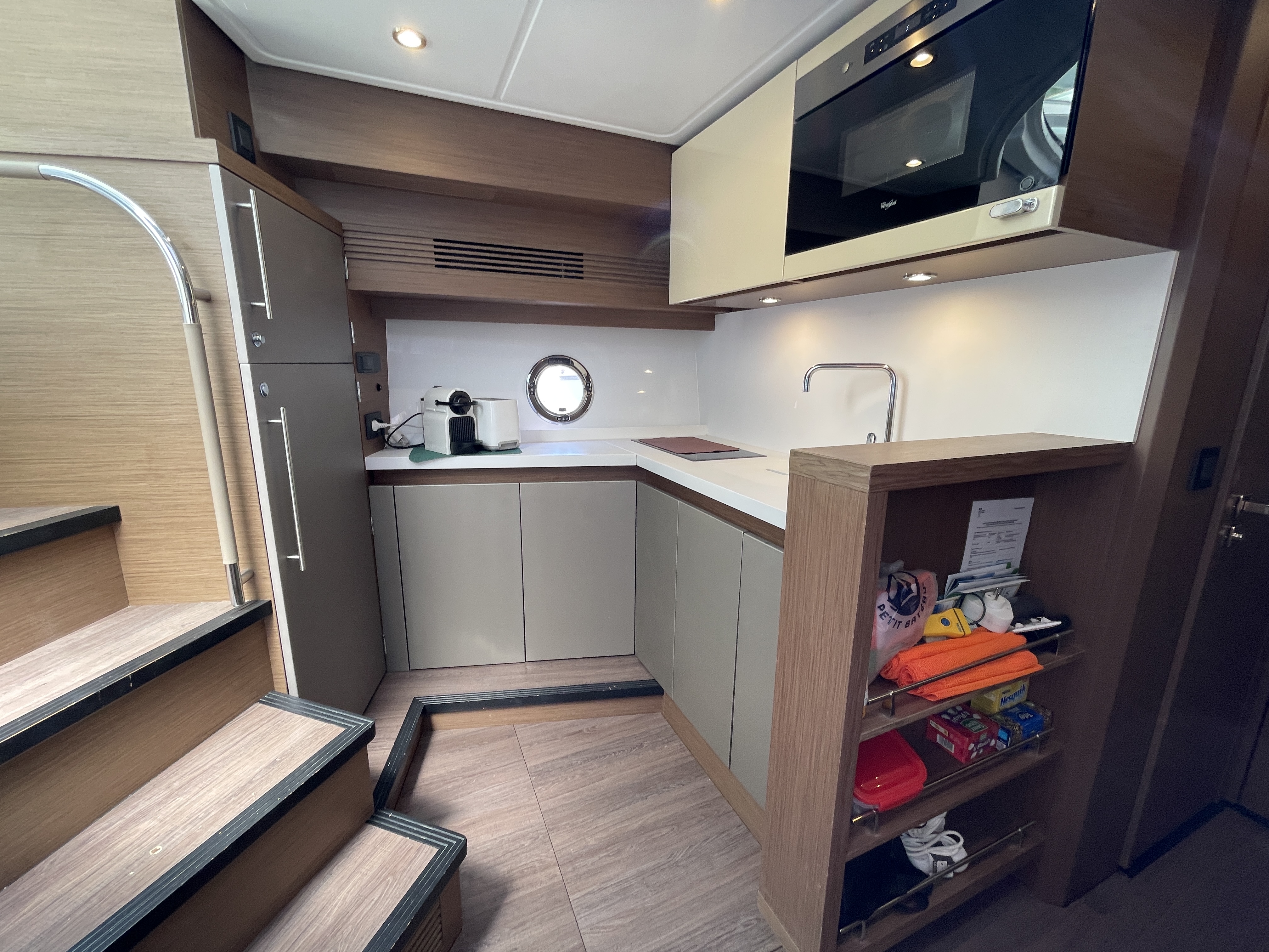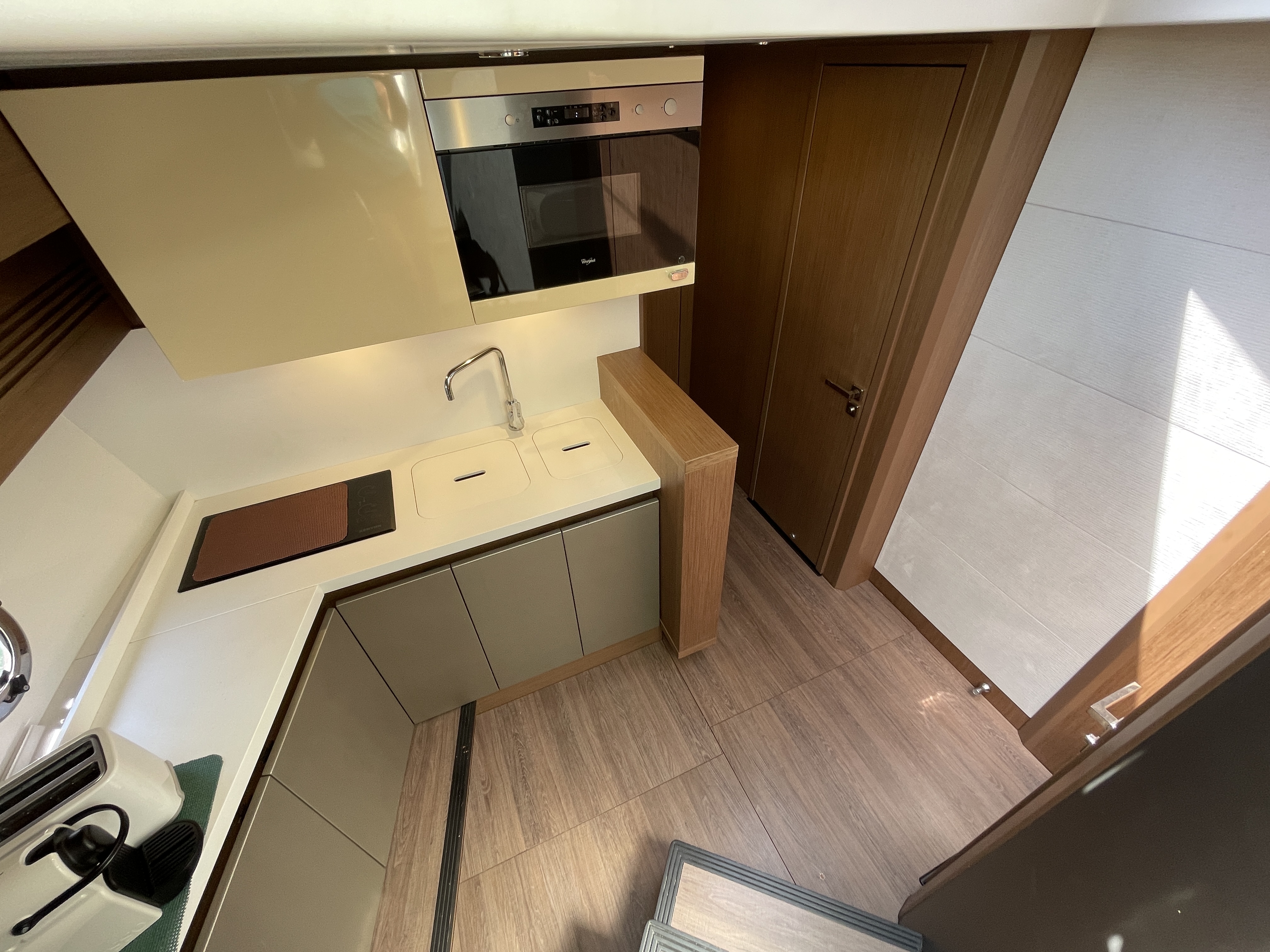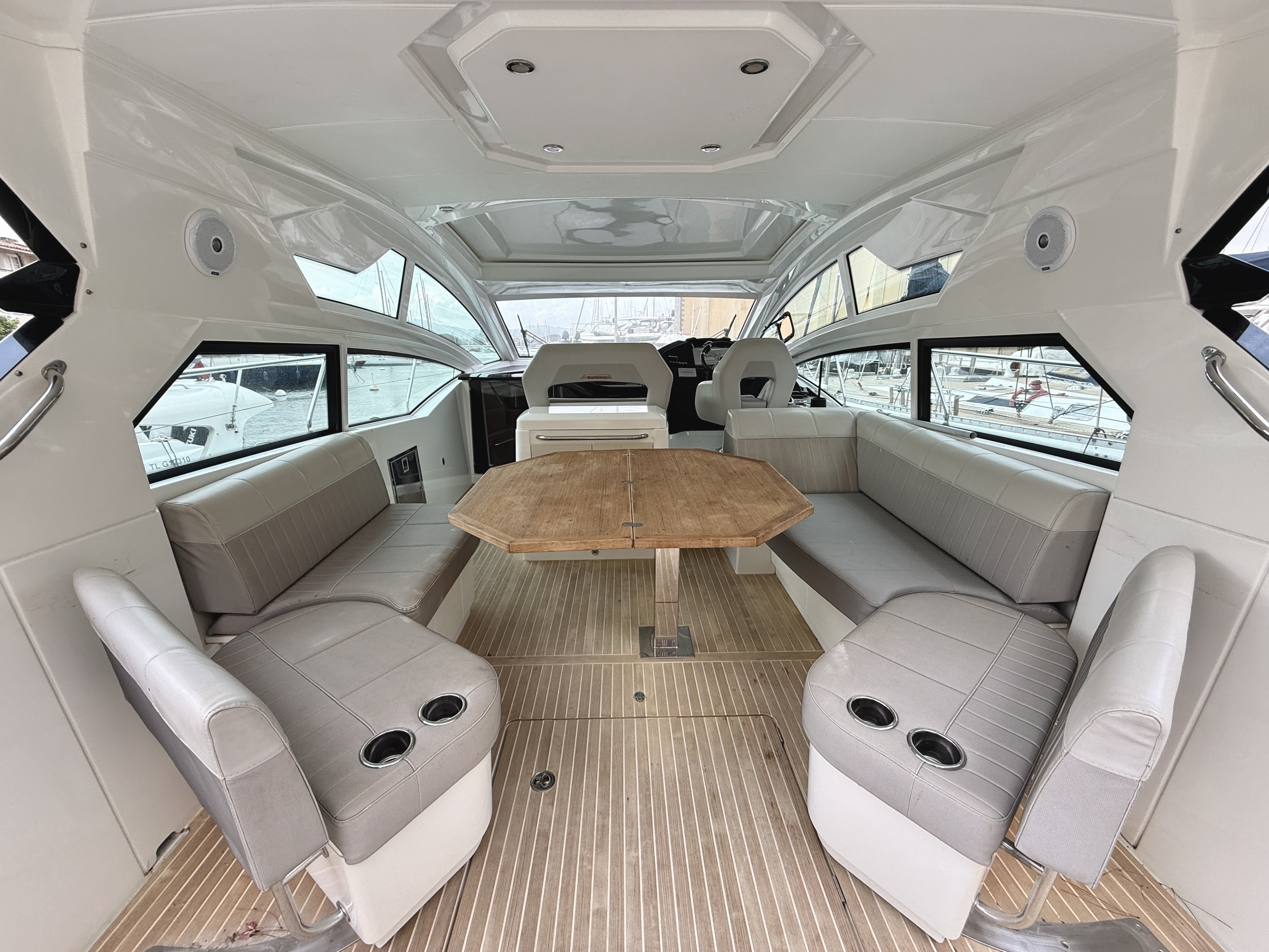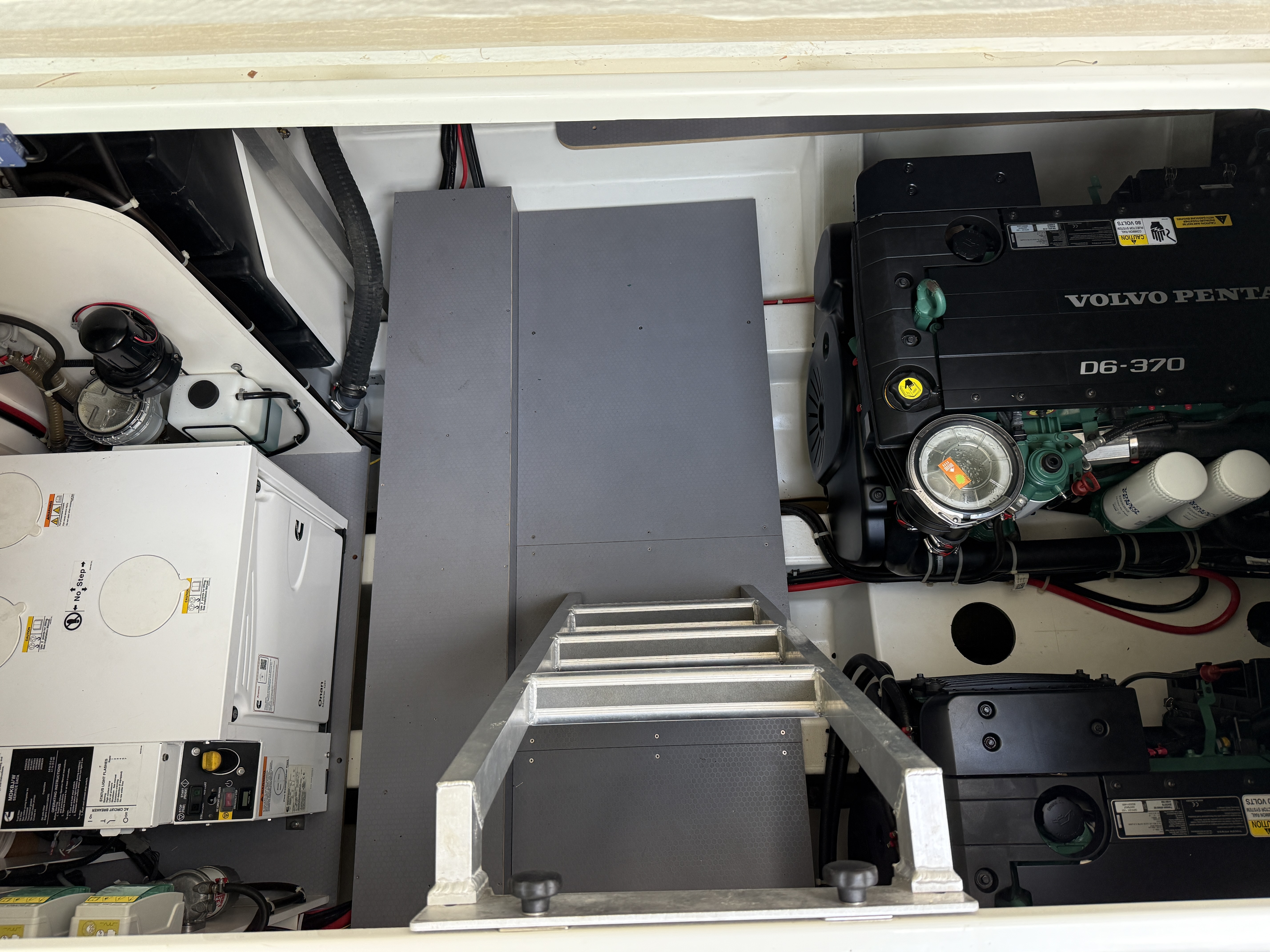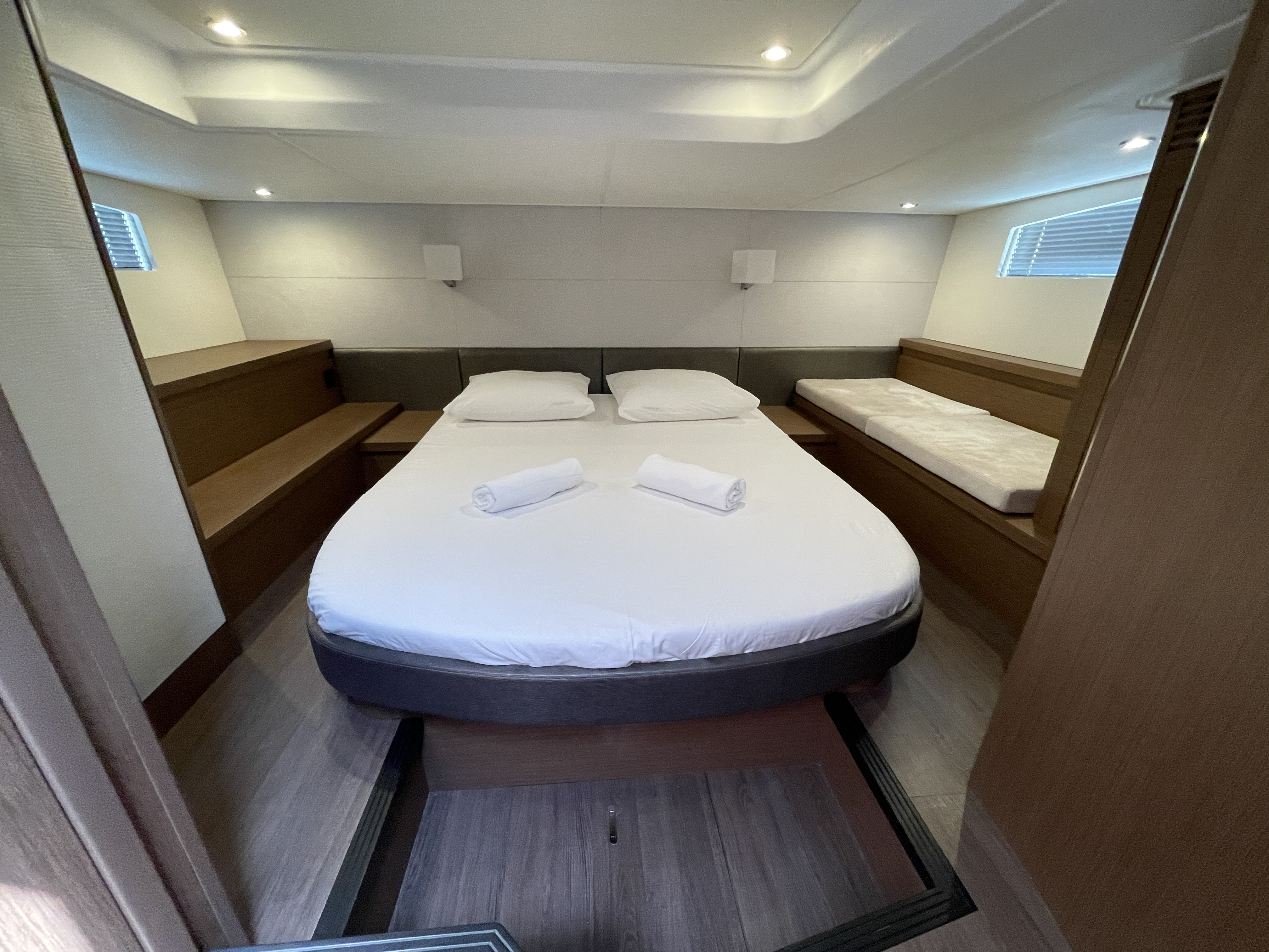 You'll be captivated by its contemporary design and spaciousness. Designed for fast cruising and relaxing in the Mediterranean, it features two Volvo D6-370 hp engines with proven reliability, a hydraulic platform for your watersports, and a teak deck that extends the pleasure at anchor.
