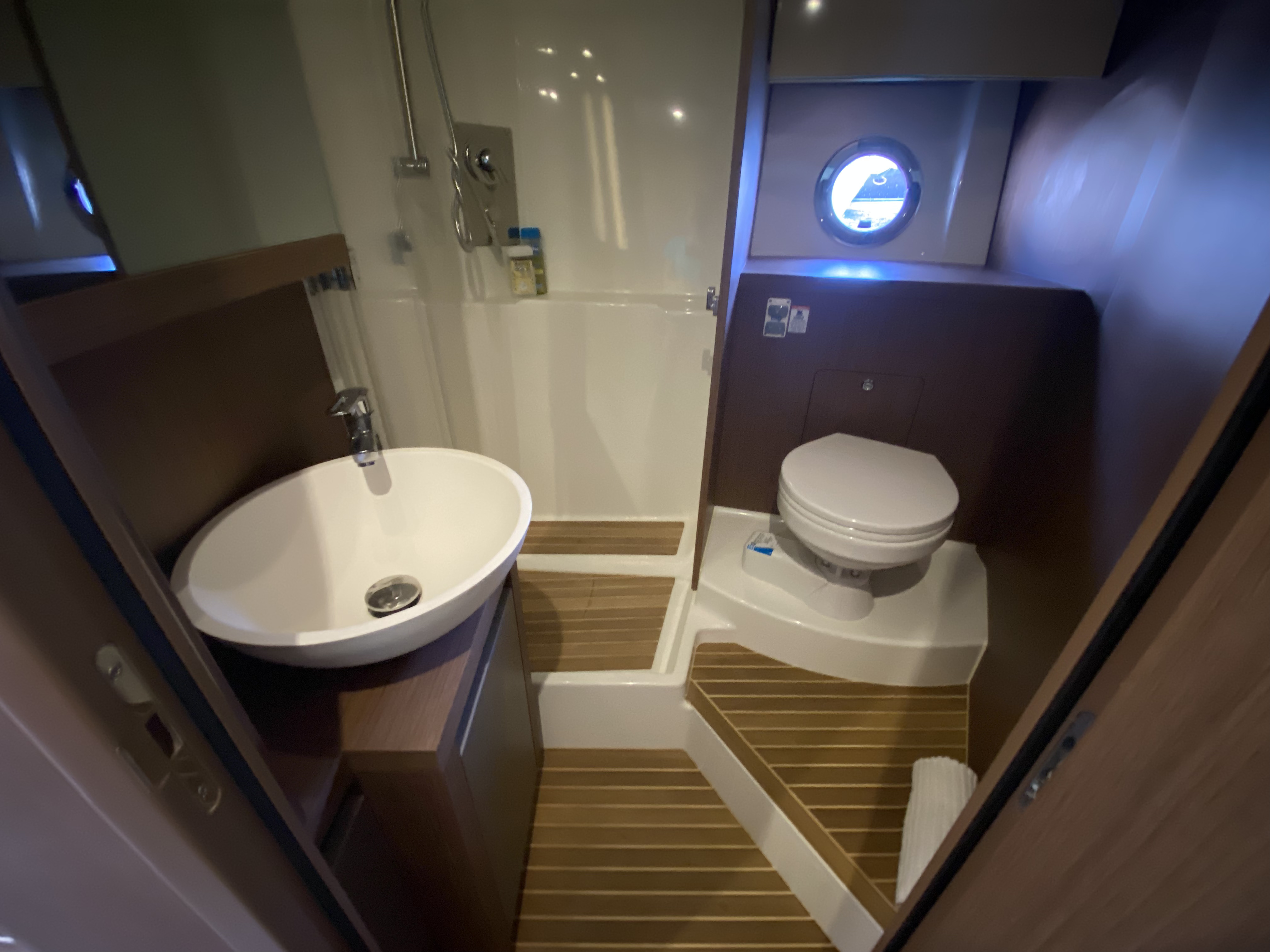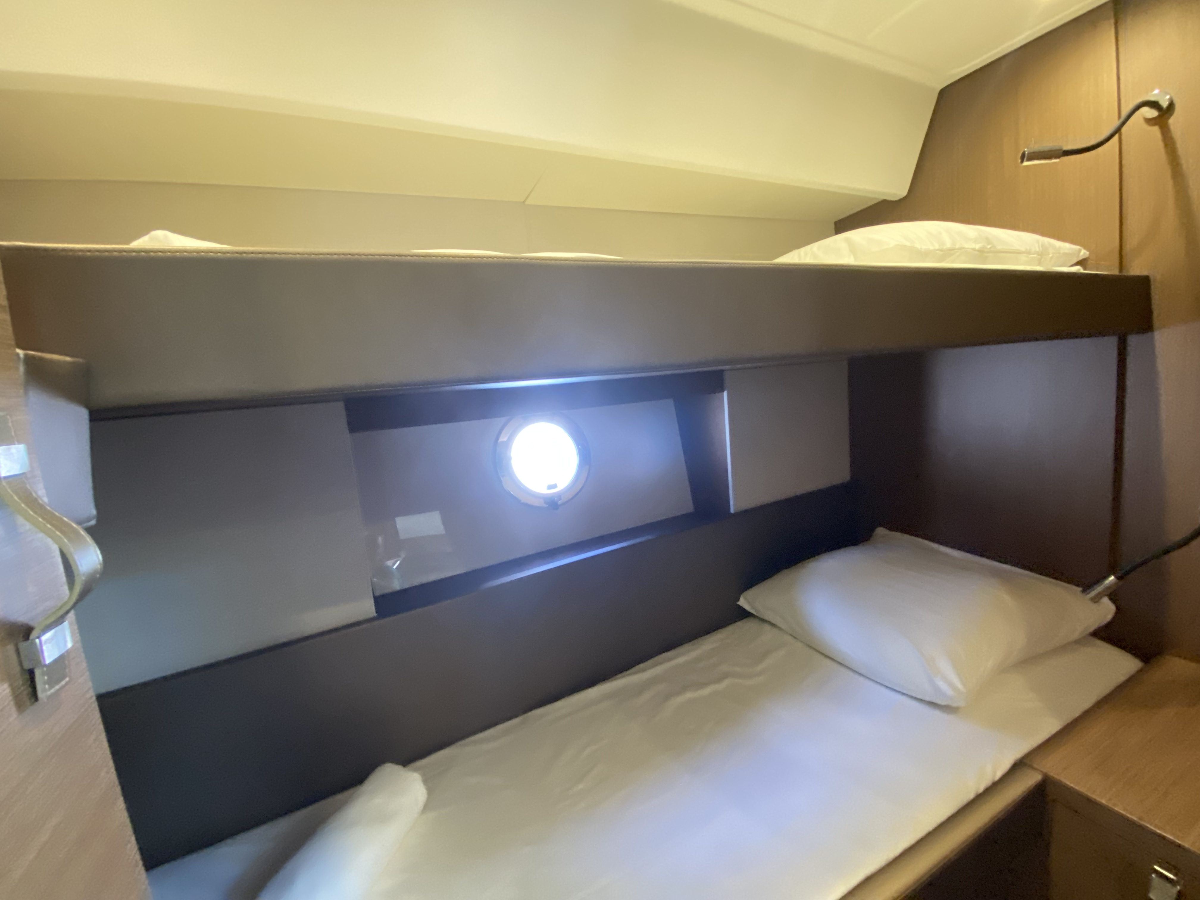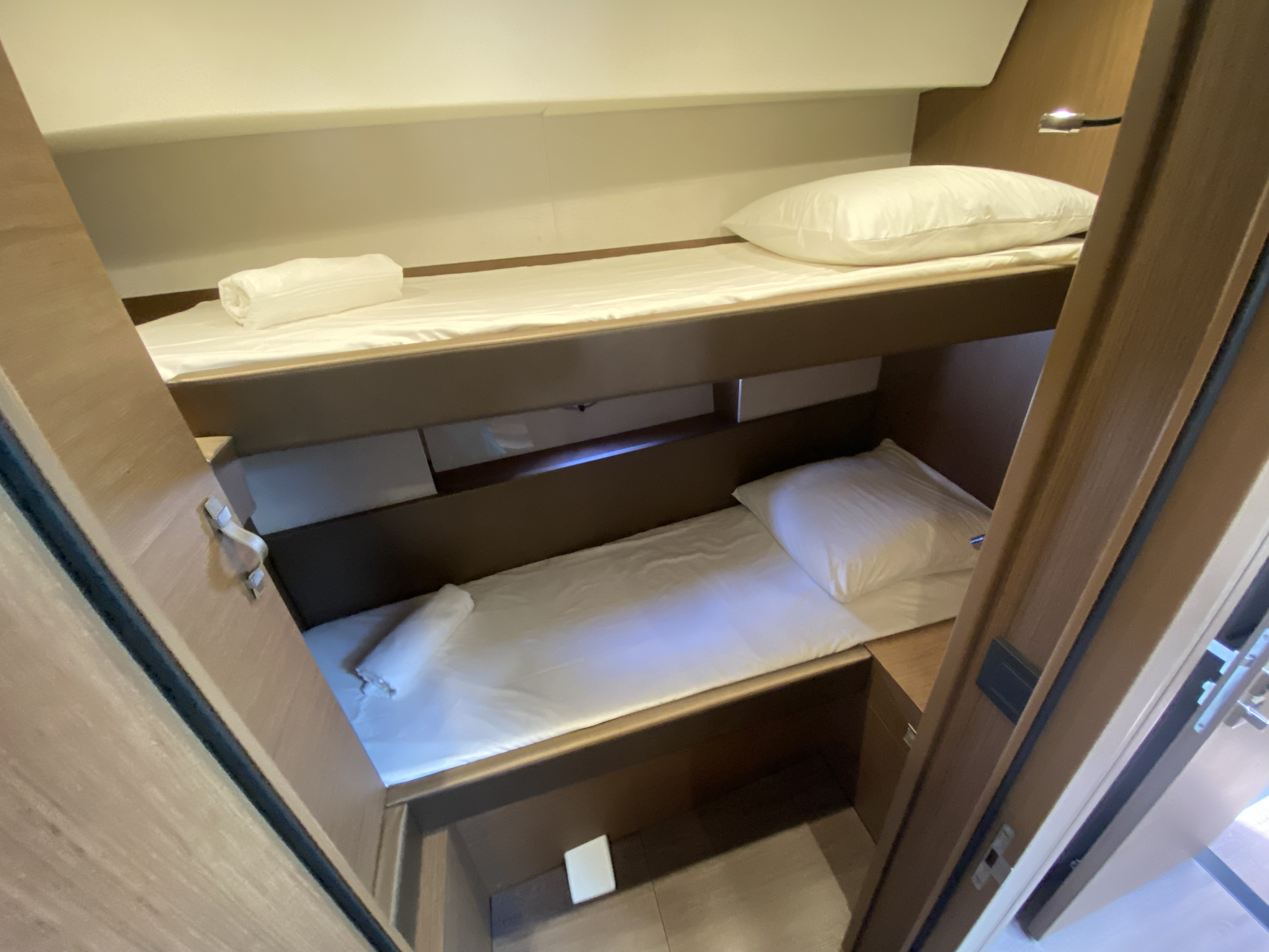 Its spacious interior features three cabins (one double master cabin, one forward cabin with a double bed convertible into two single beds, and one cabin with bunk beds) and two bathrooms, with a fully equipped galley (refrigerator, freezer, microwave, stove) and reversible air conditioning for optimal comfort.
