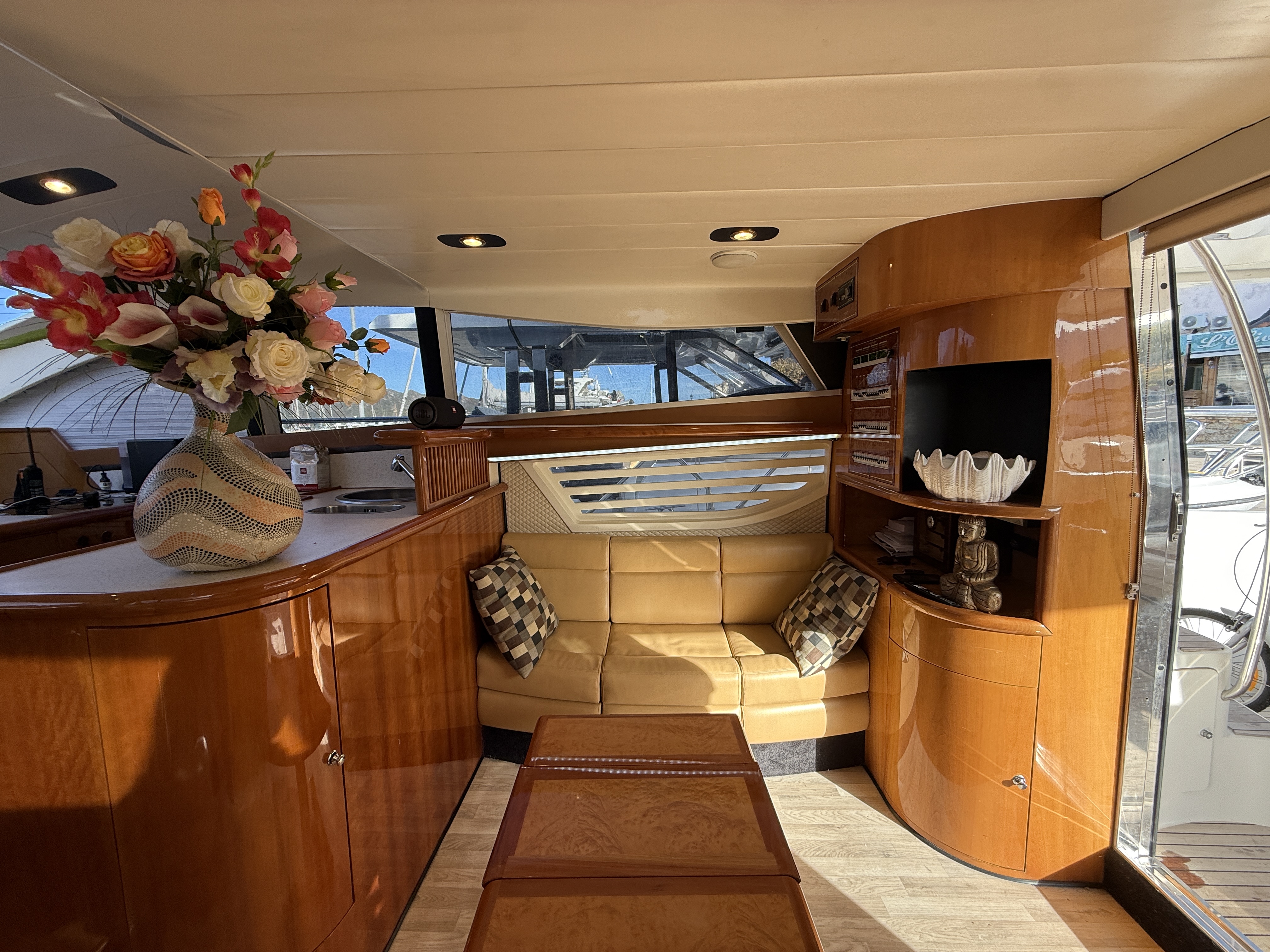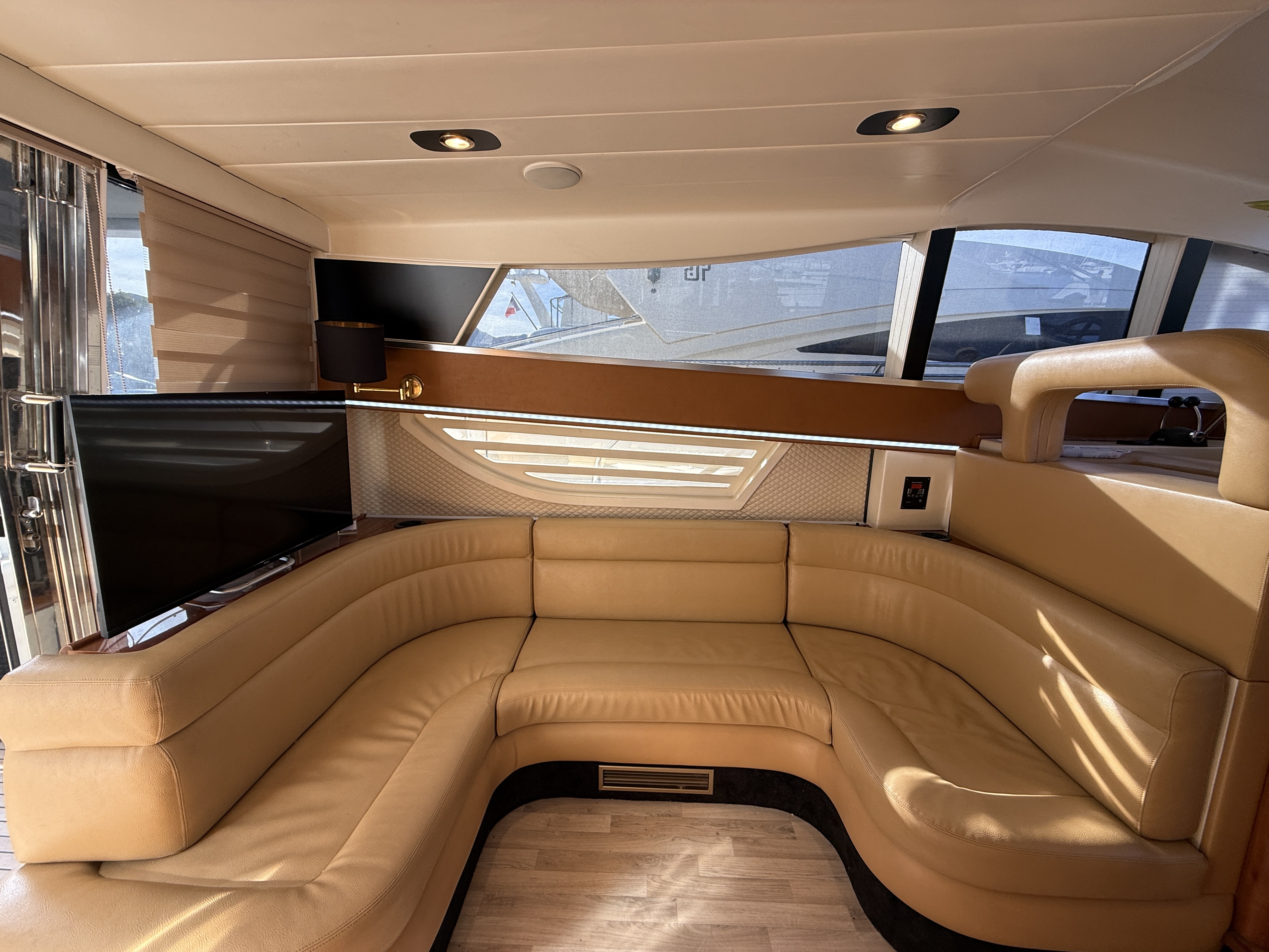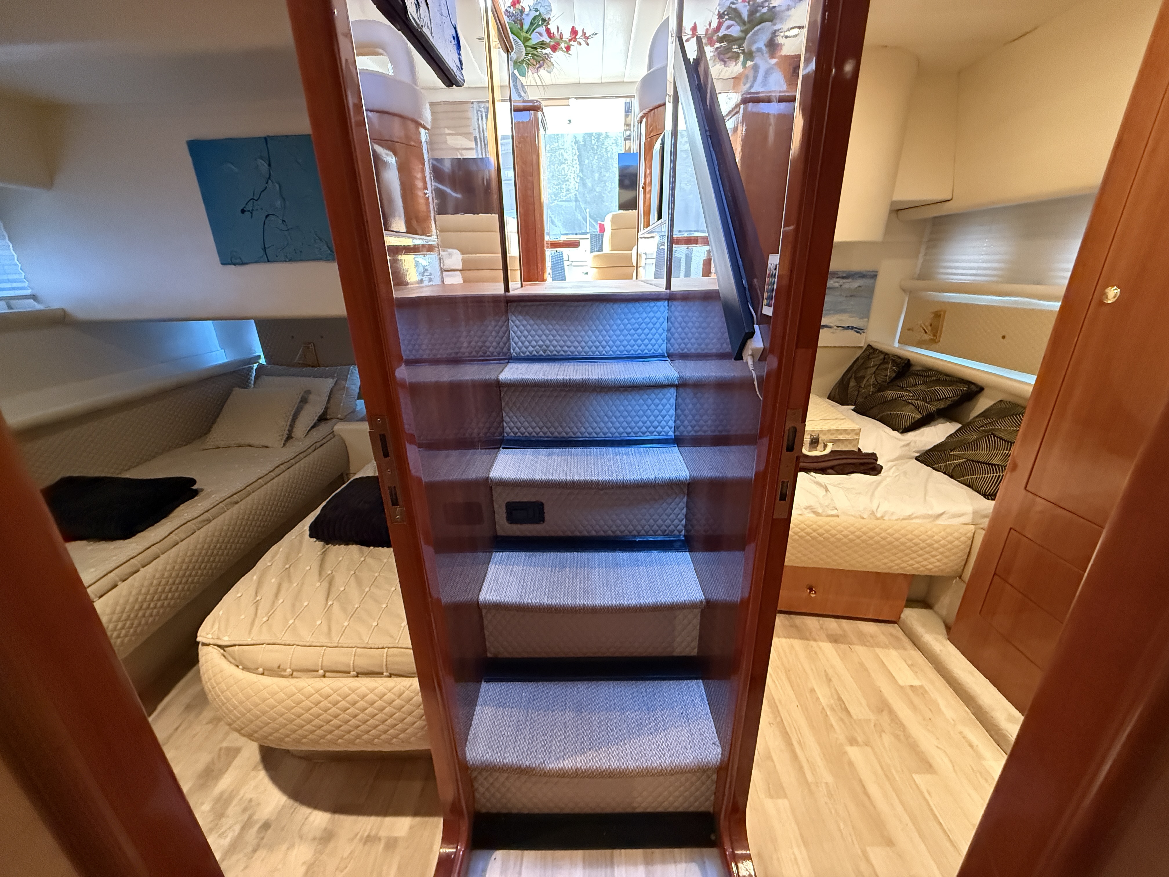 This boat features many other options such as a bow thruster, generator, inverter, GPS, TV antenna, heating/air conditioning, and more.