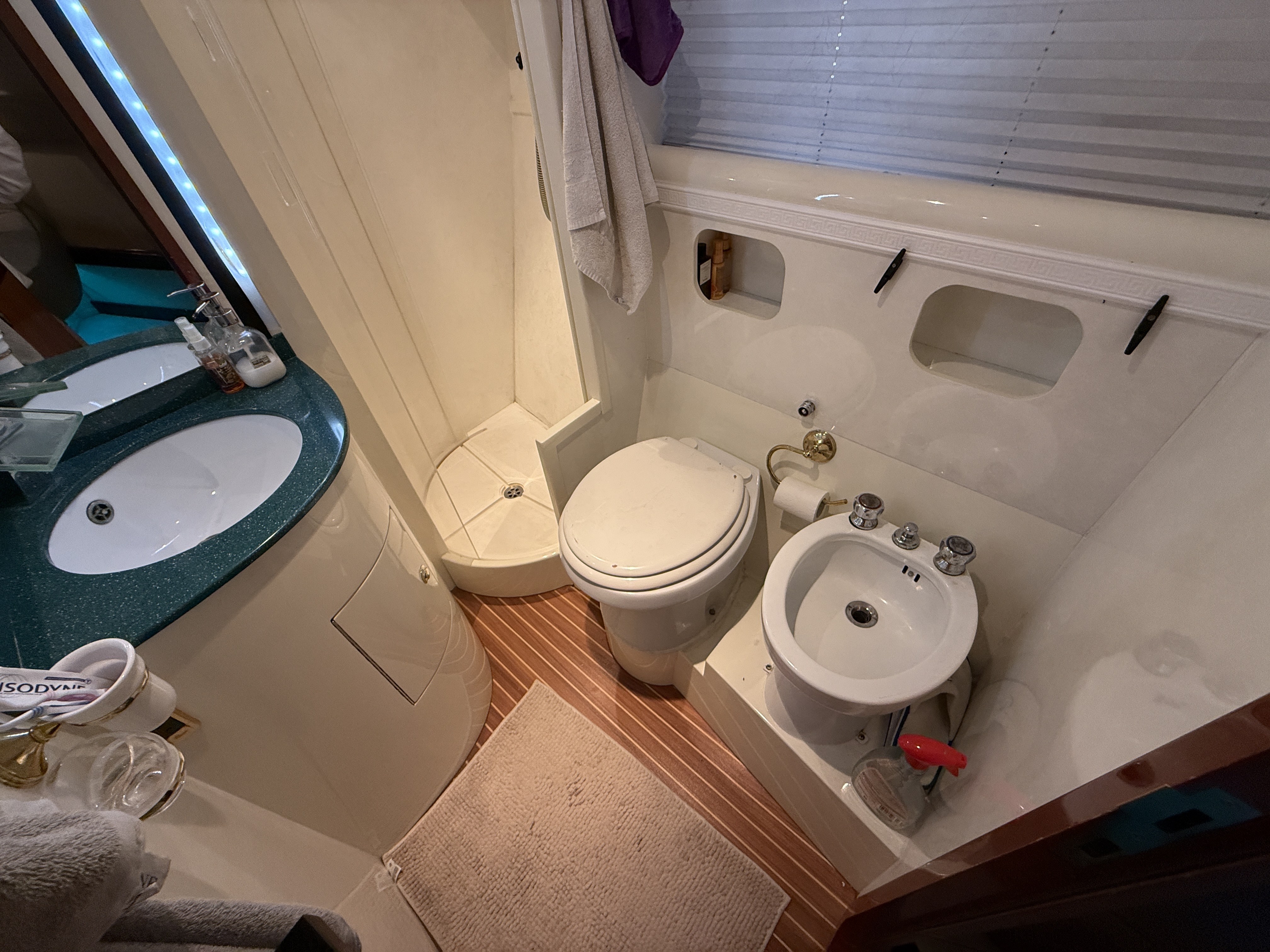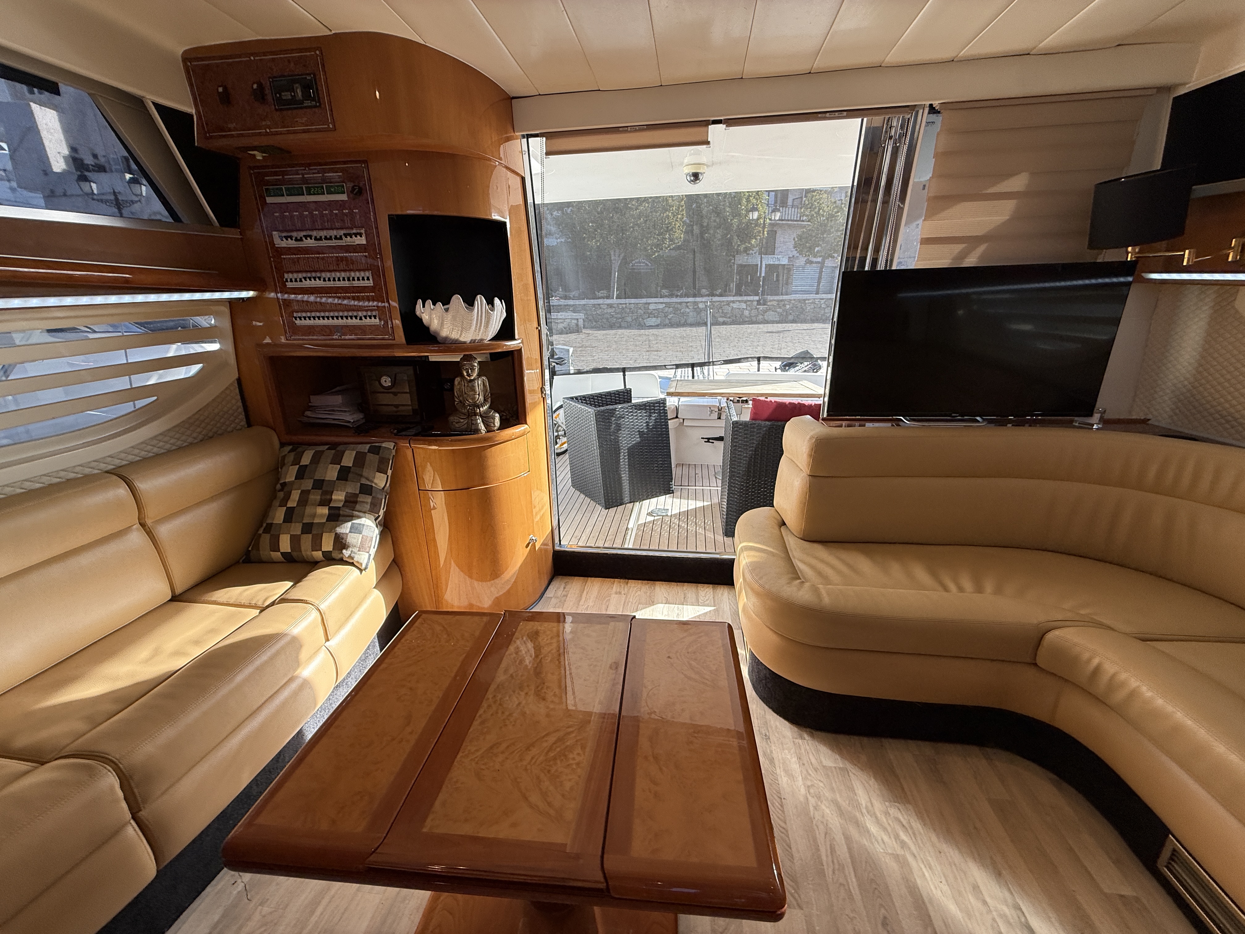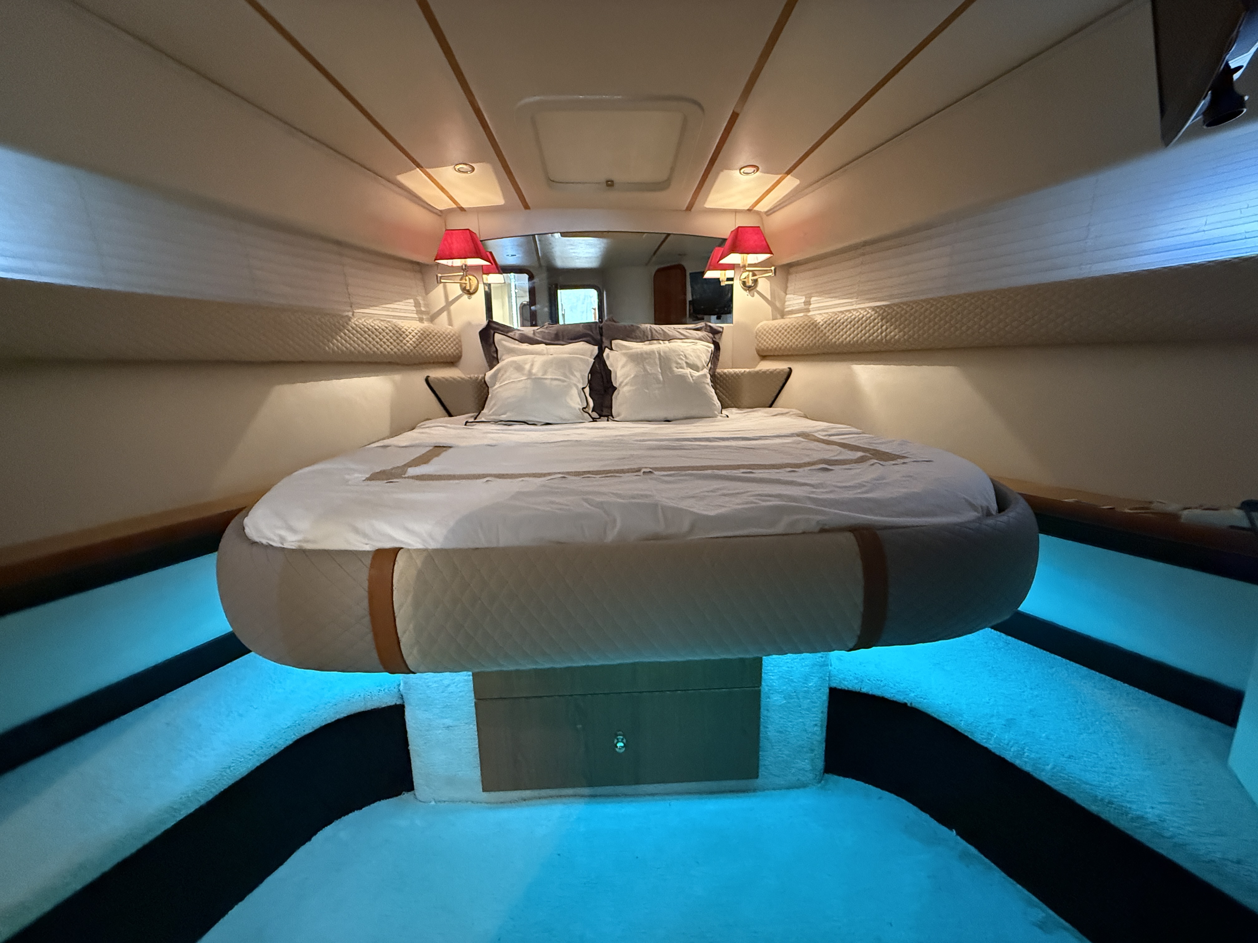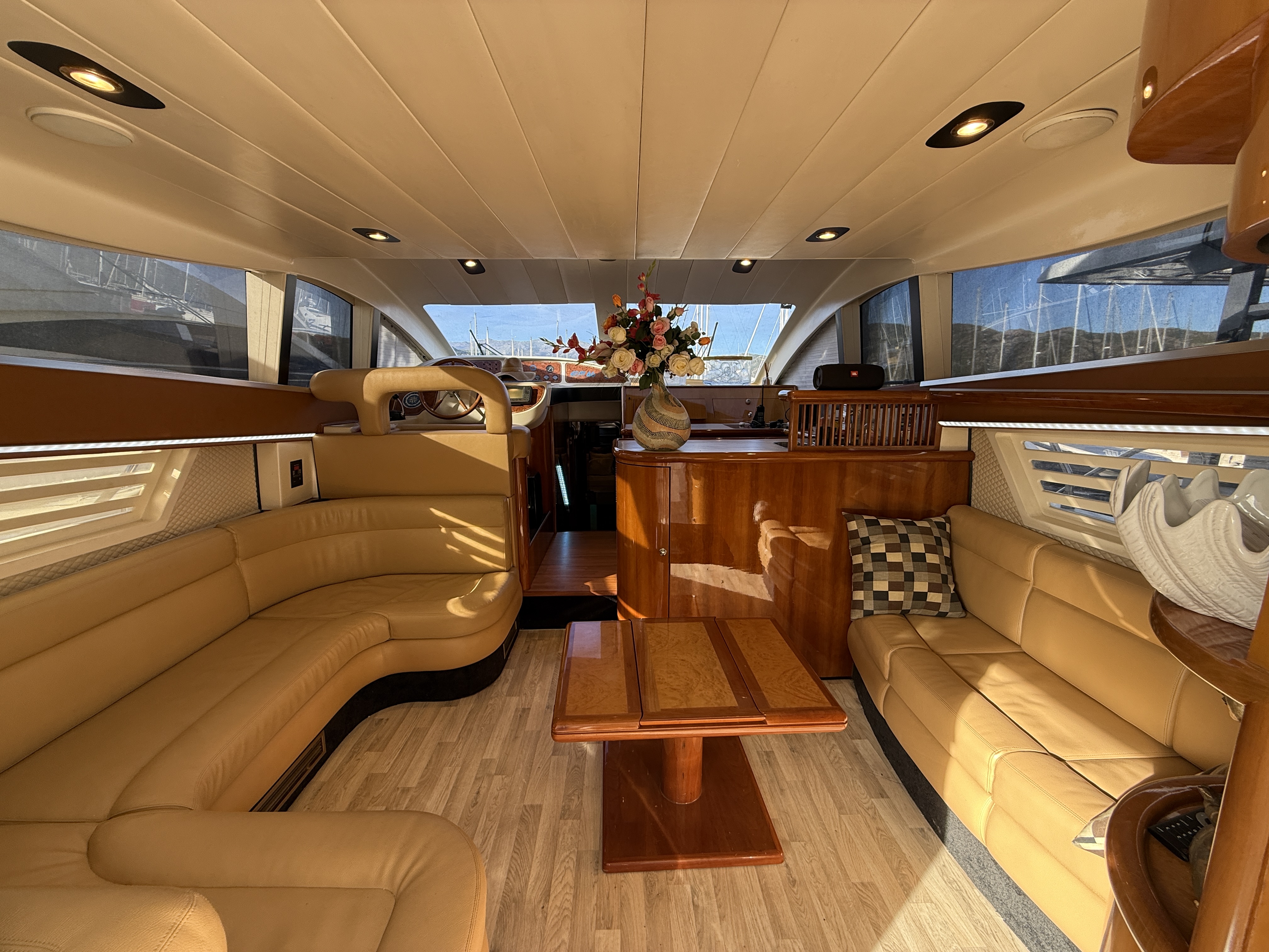 This boat features many other options such as a bow thruster, generator, inverter, GPS, TV antenna, heating/air conditioning, and more.