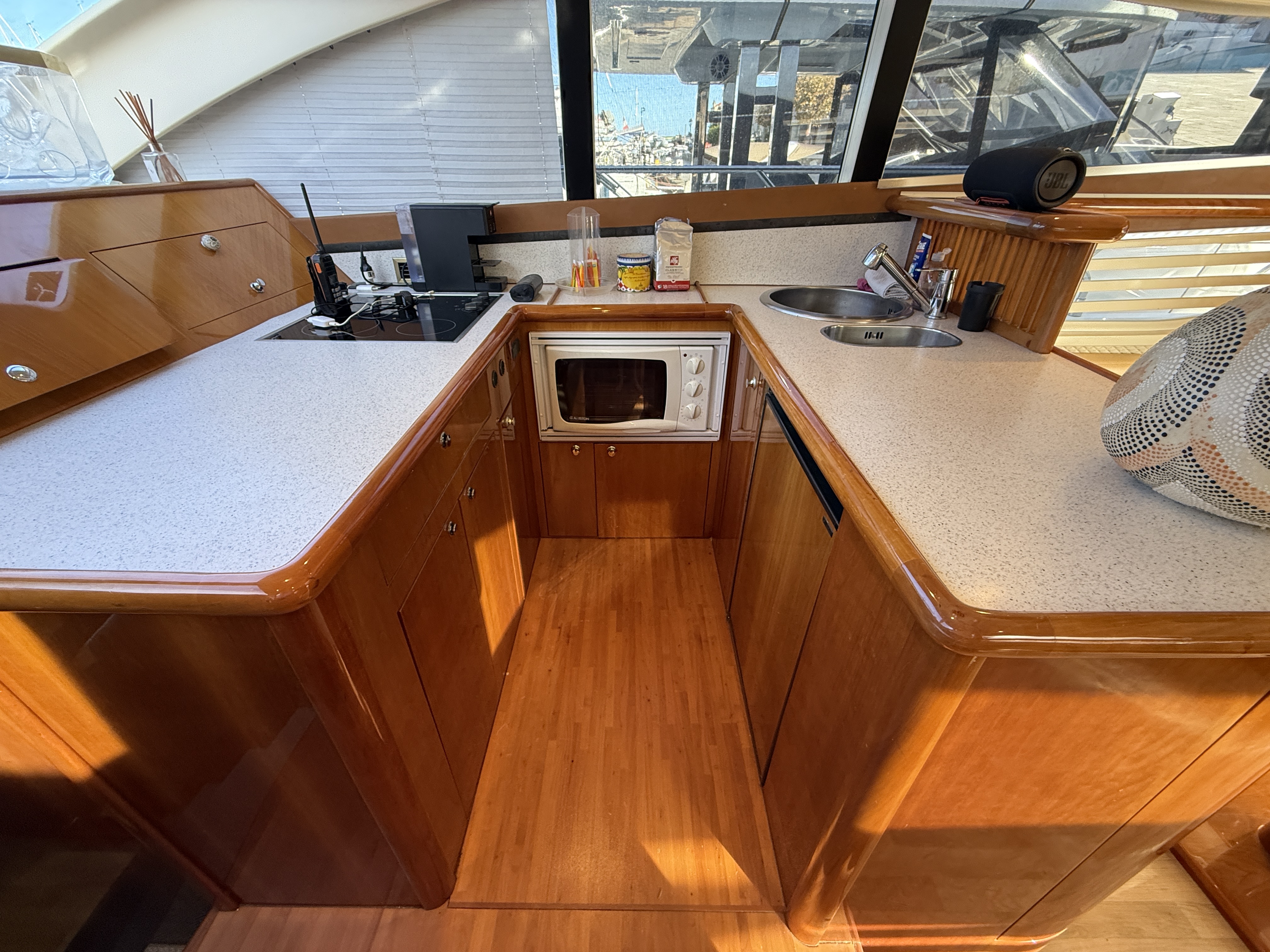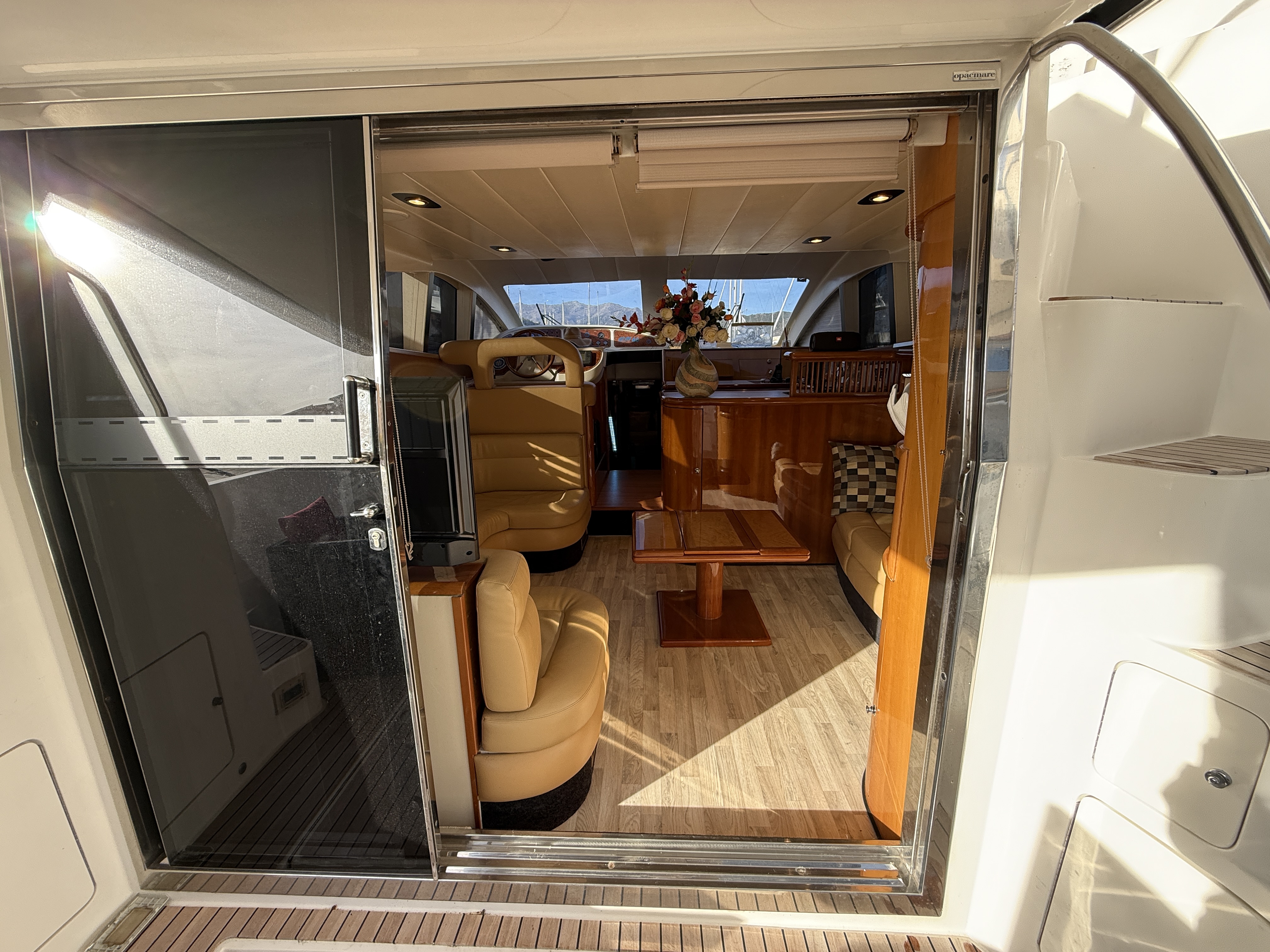 Outside, you'll find a large cockpit, a forward sundeck with a bimini, and a pleasant flybridge covered with a hard top at the front and a bimini at the rear.