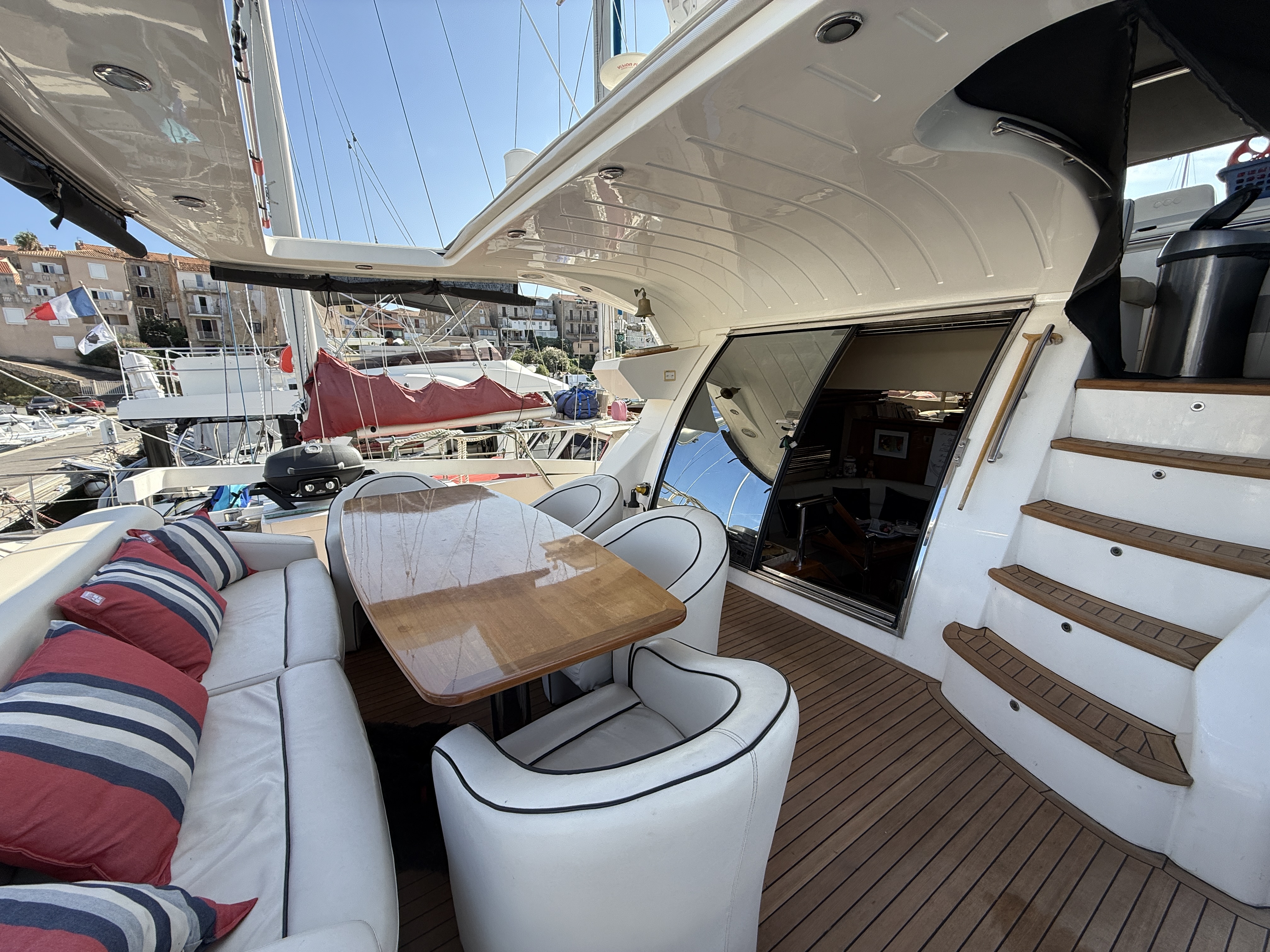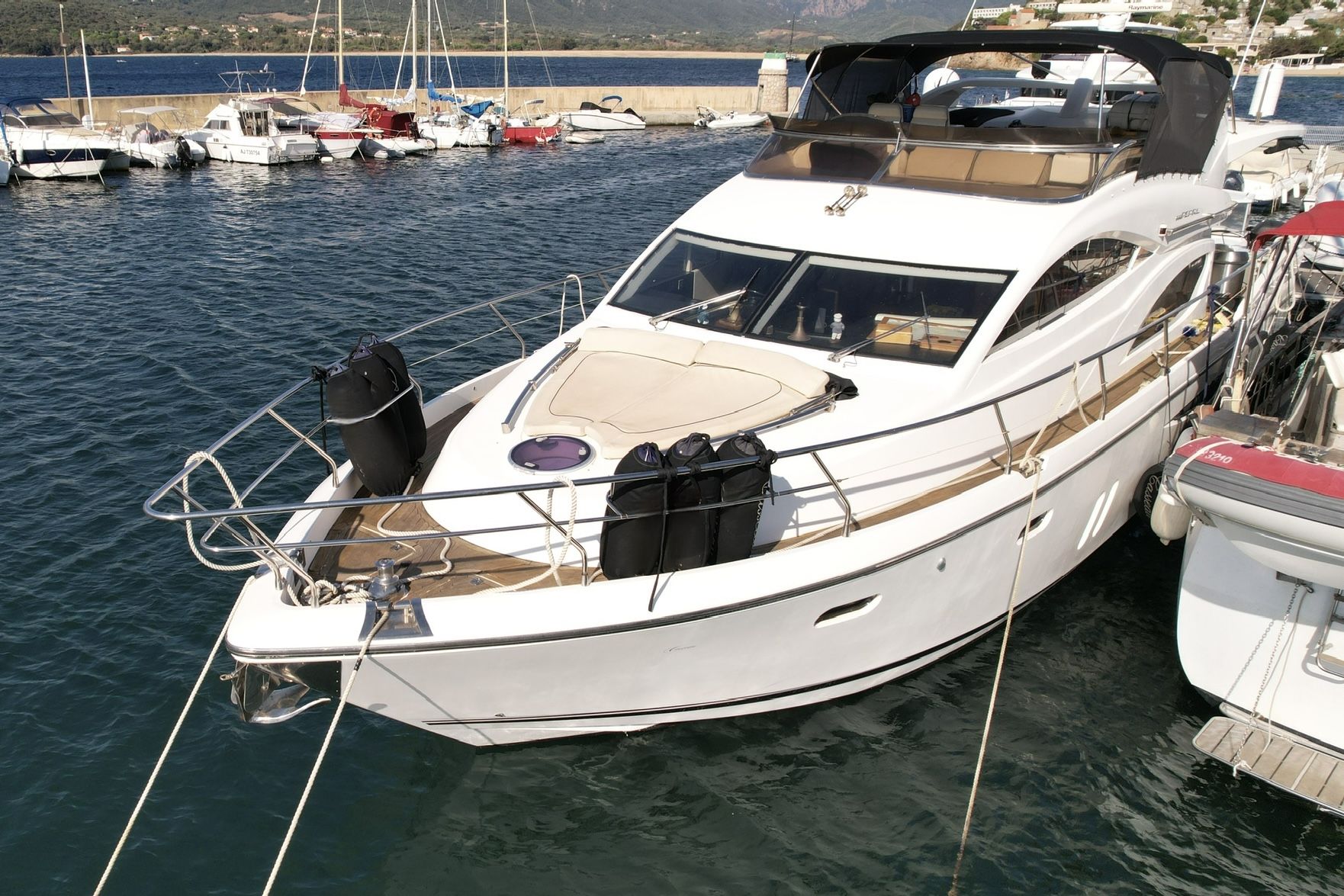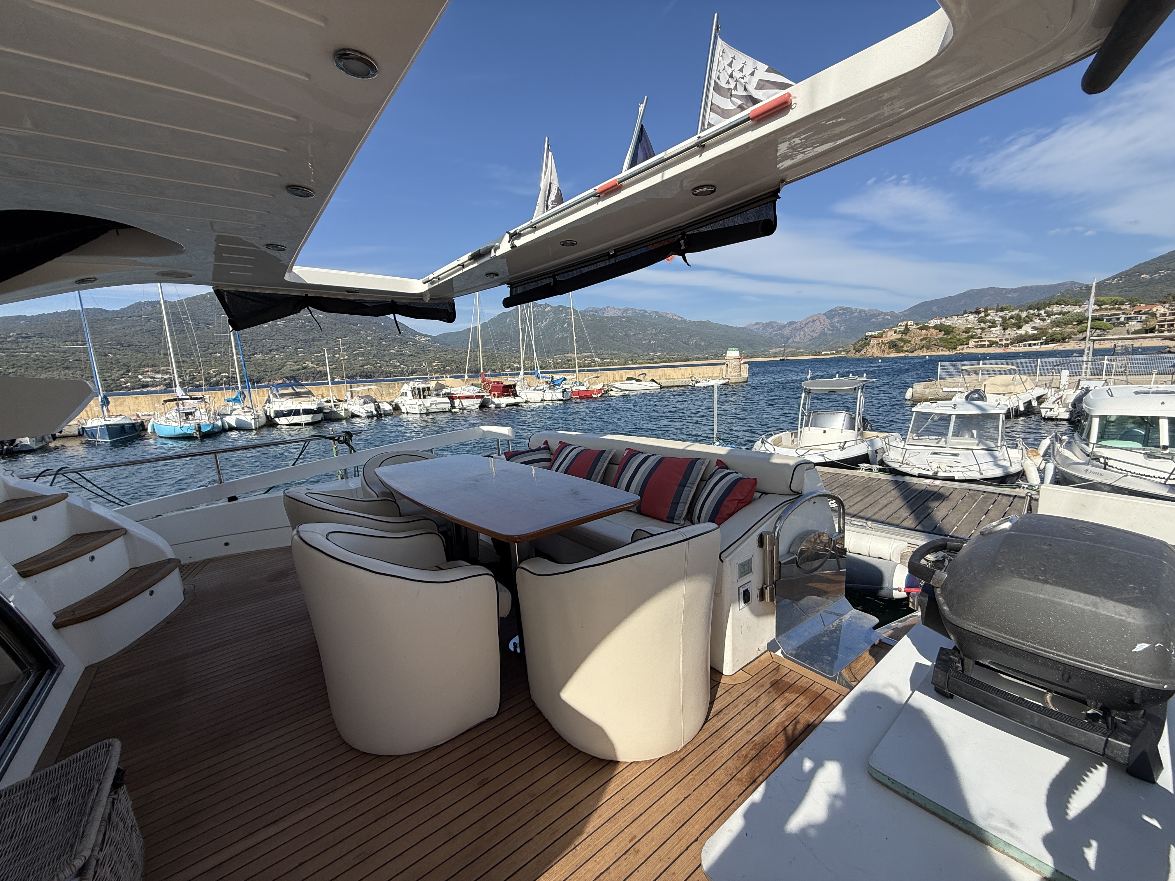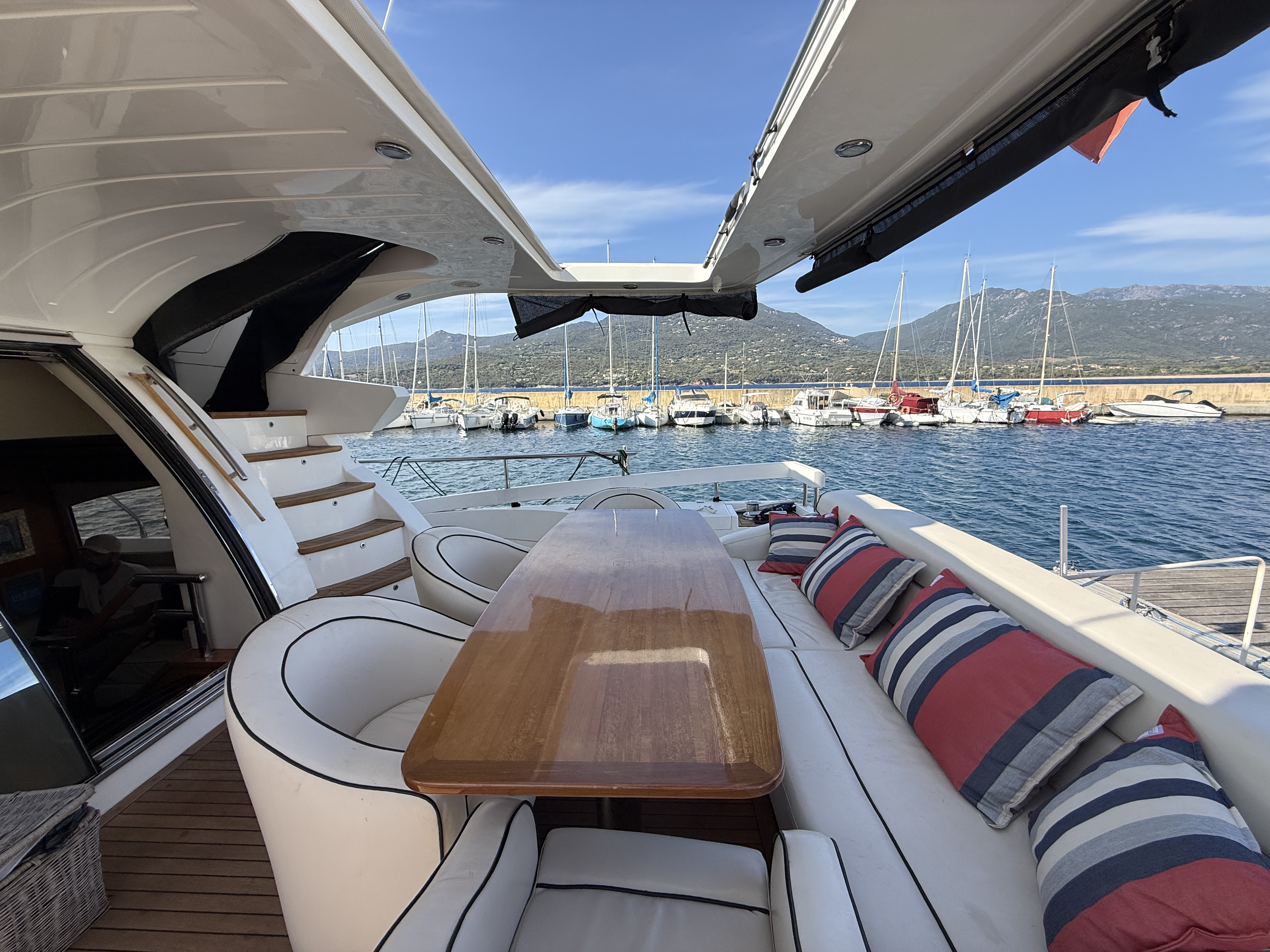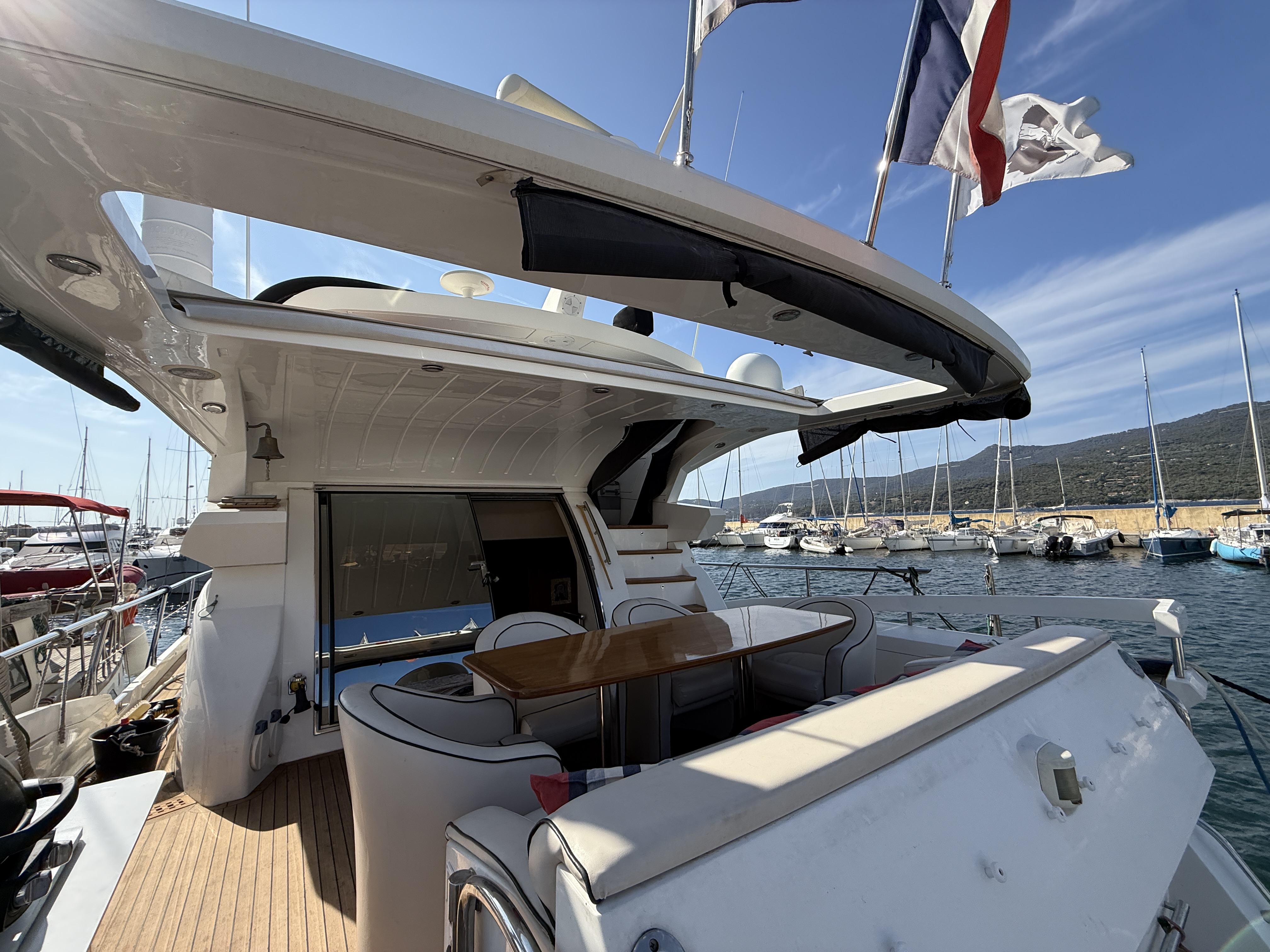 Exteriorly, the yacht offers a spacious flybridge with a dining area and sunbathing areas, a convivial aft deck protected by a large electric hardtop, and a hydraulic swim platform ideal for water sports.
