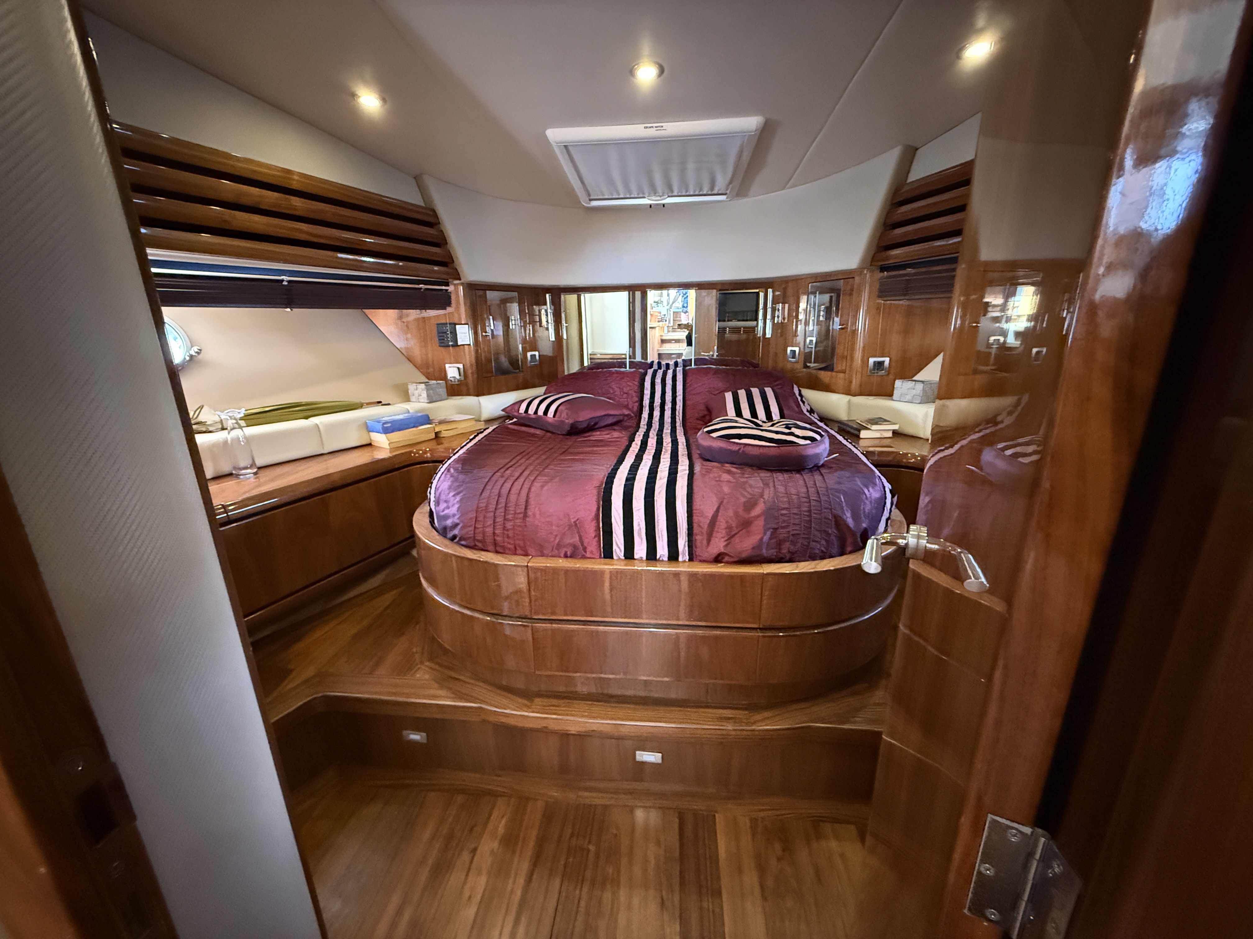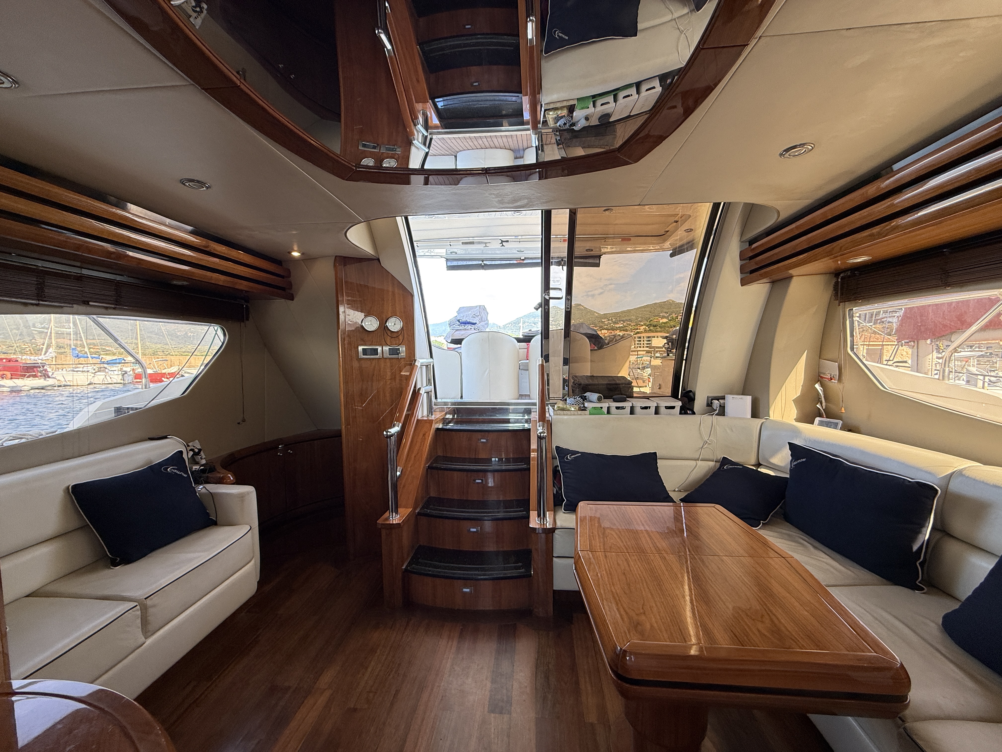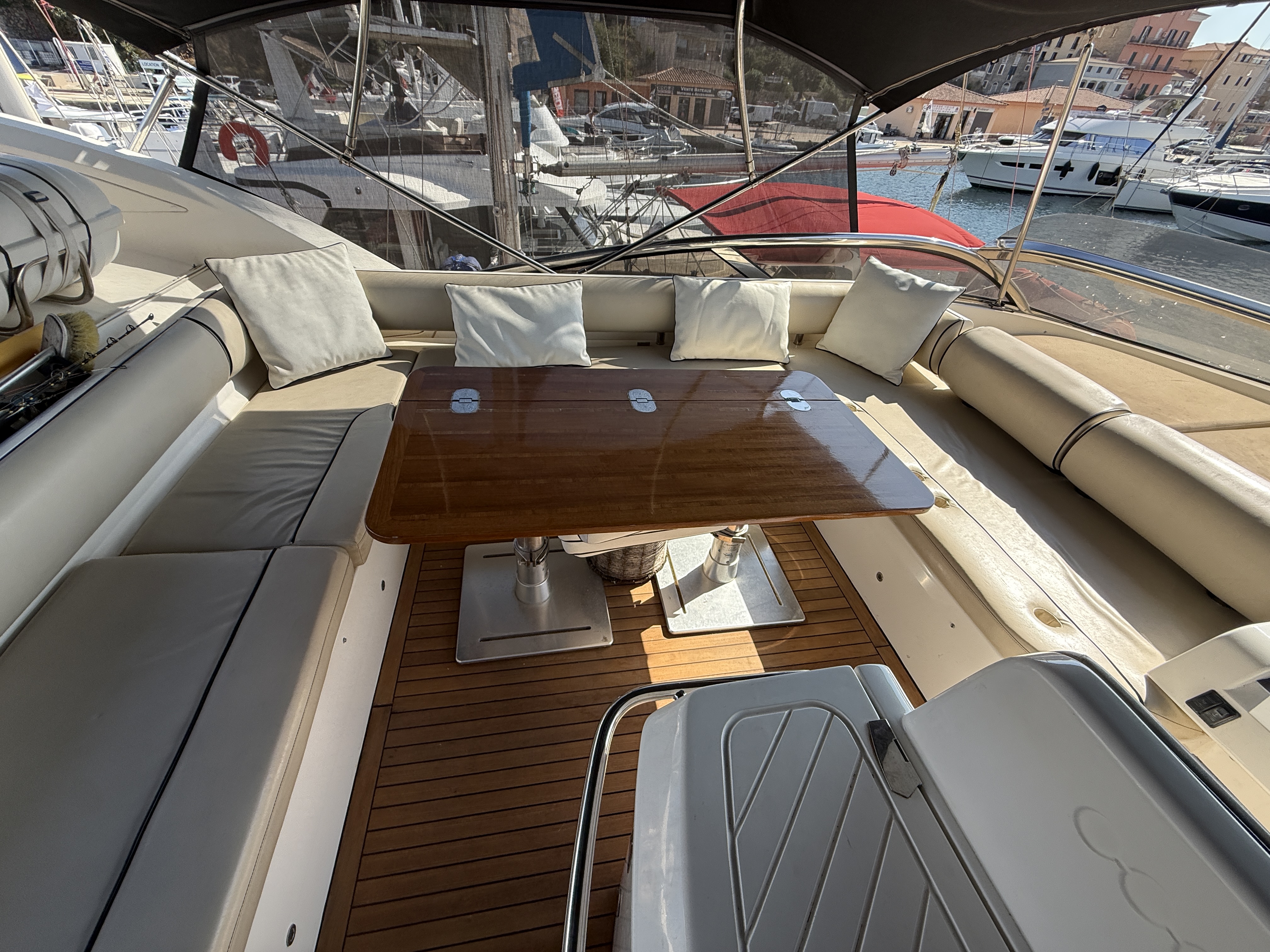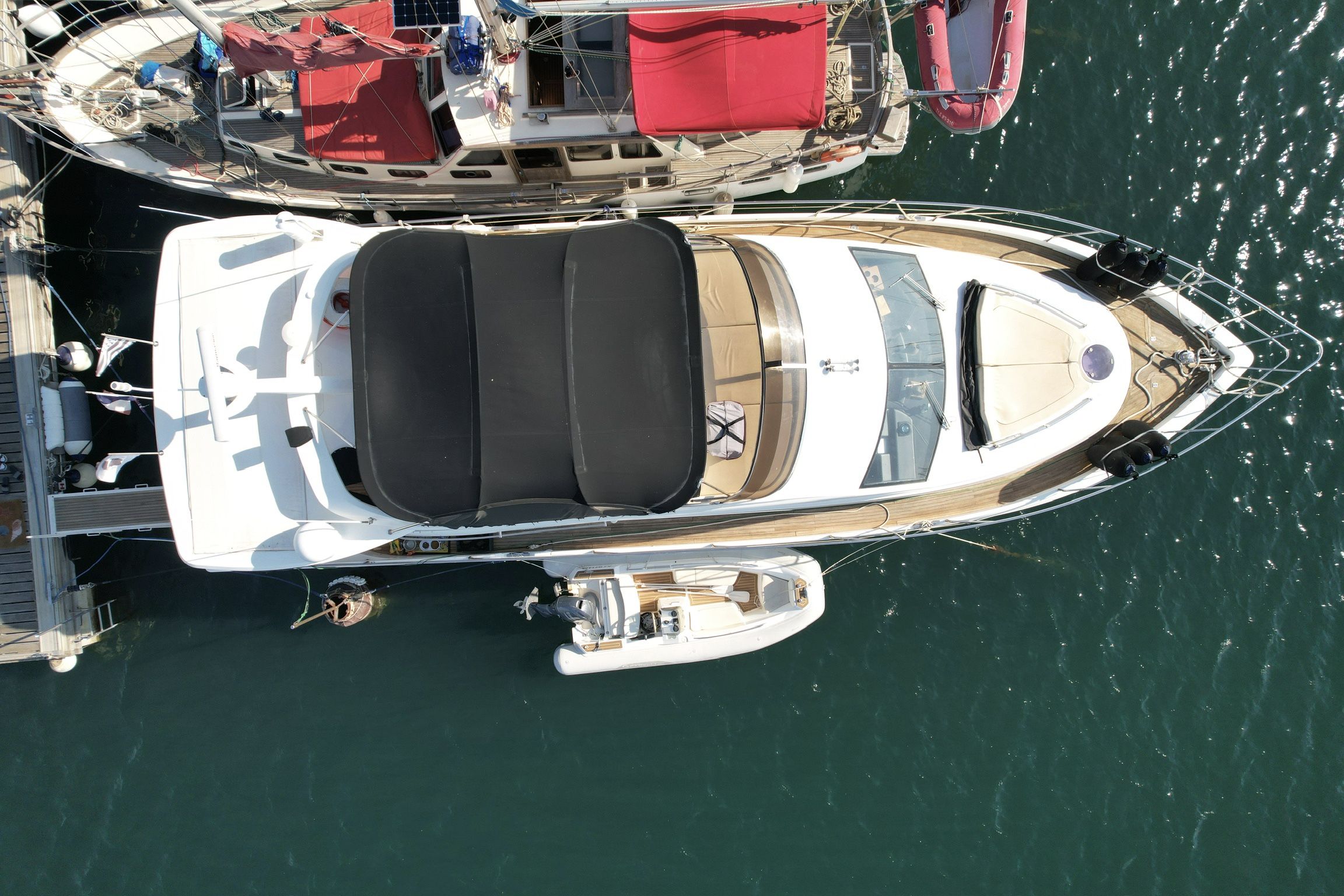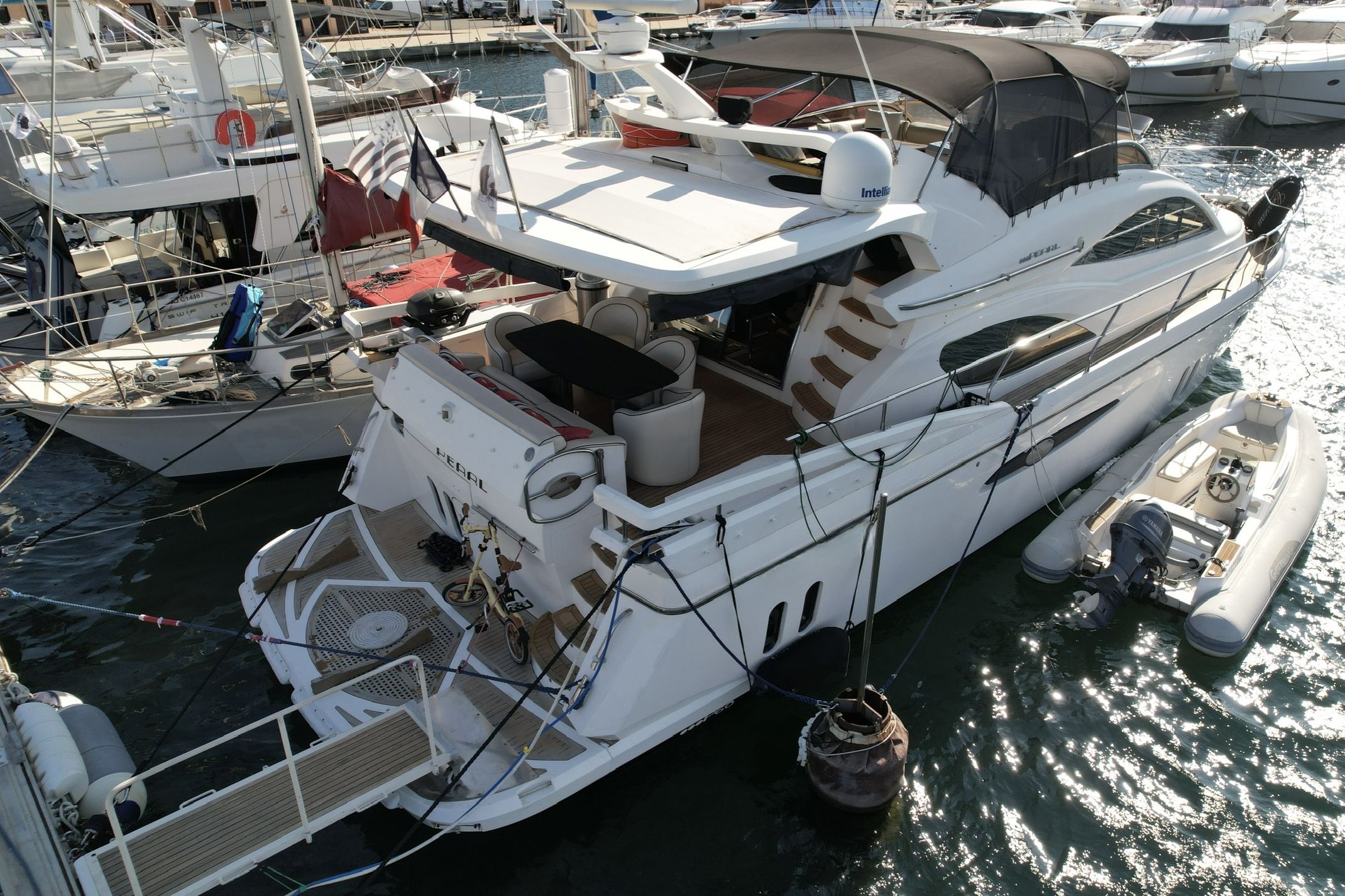 Exteriorly, the yacht offers a spacious flybridge with a dining area and sunbathing areas, a convivial aft deck protected by a large electric hardtop, and a hydraulic swim platform ideal for water sports.