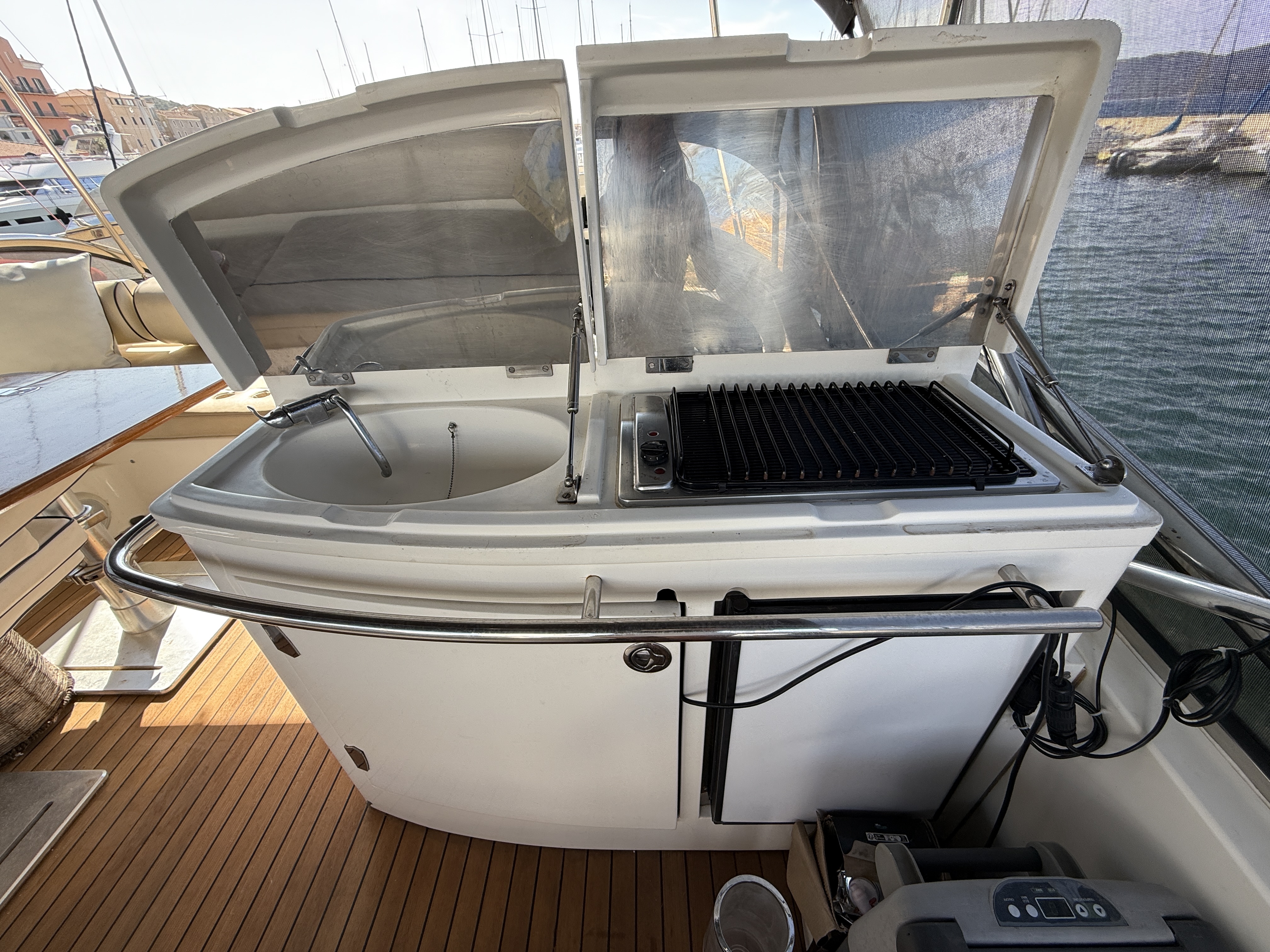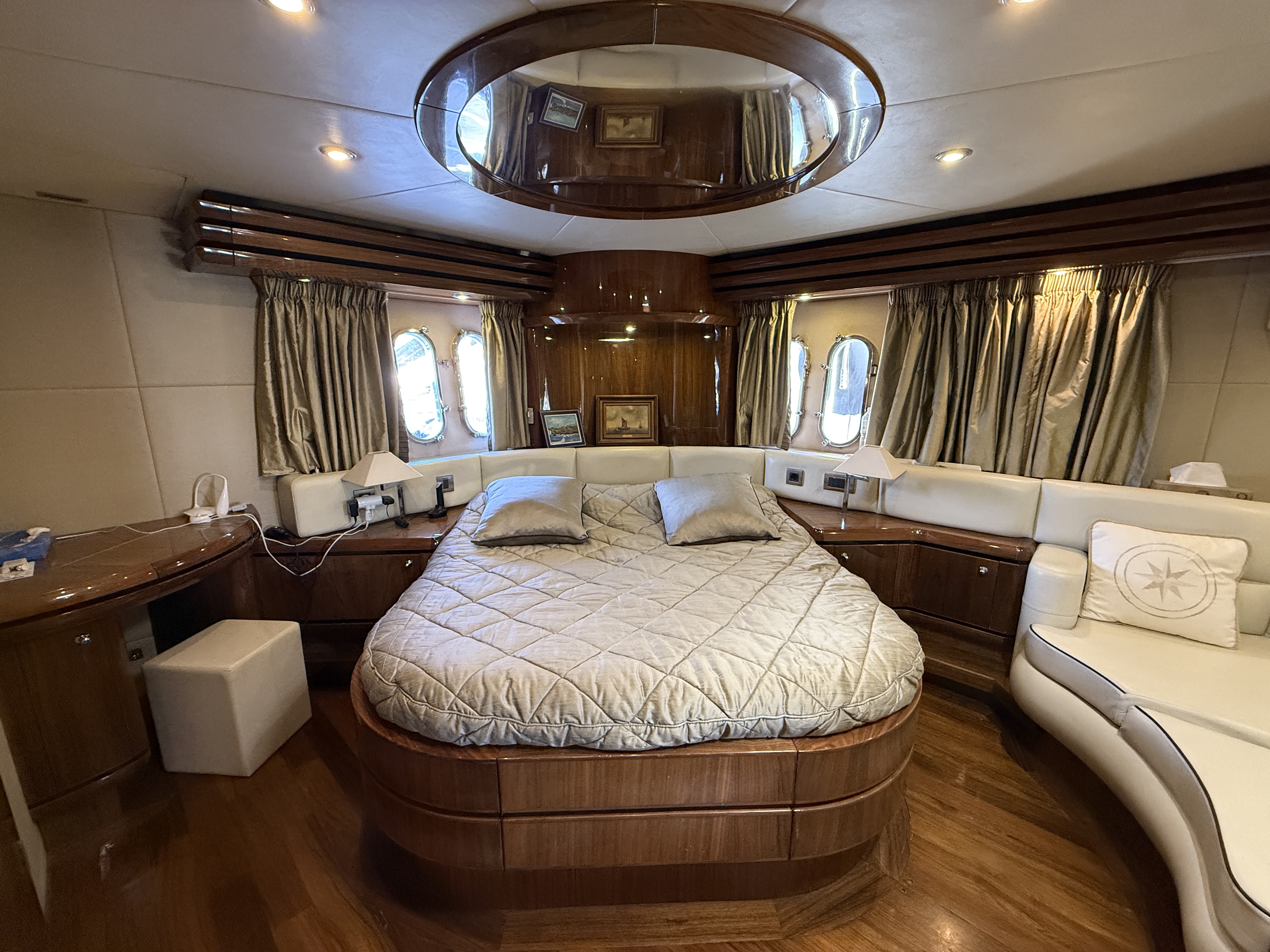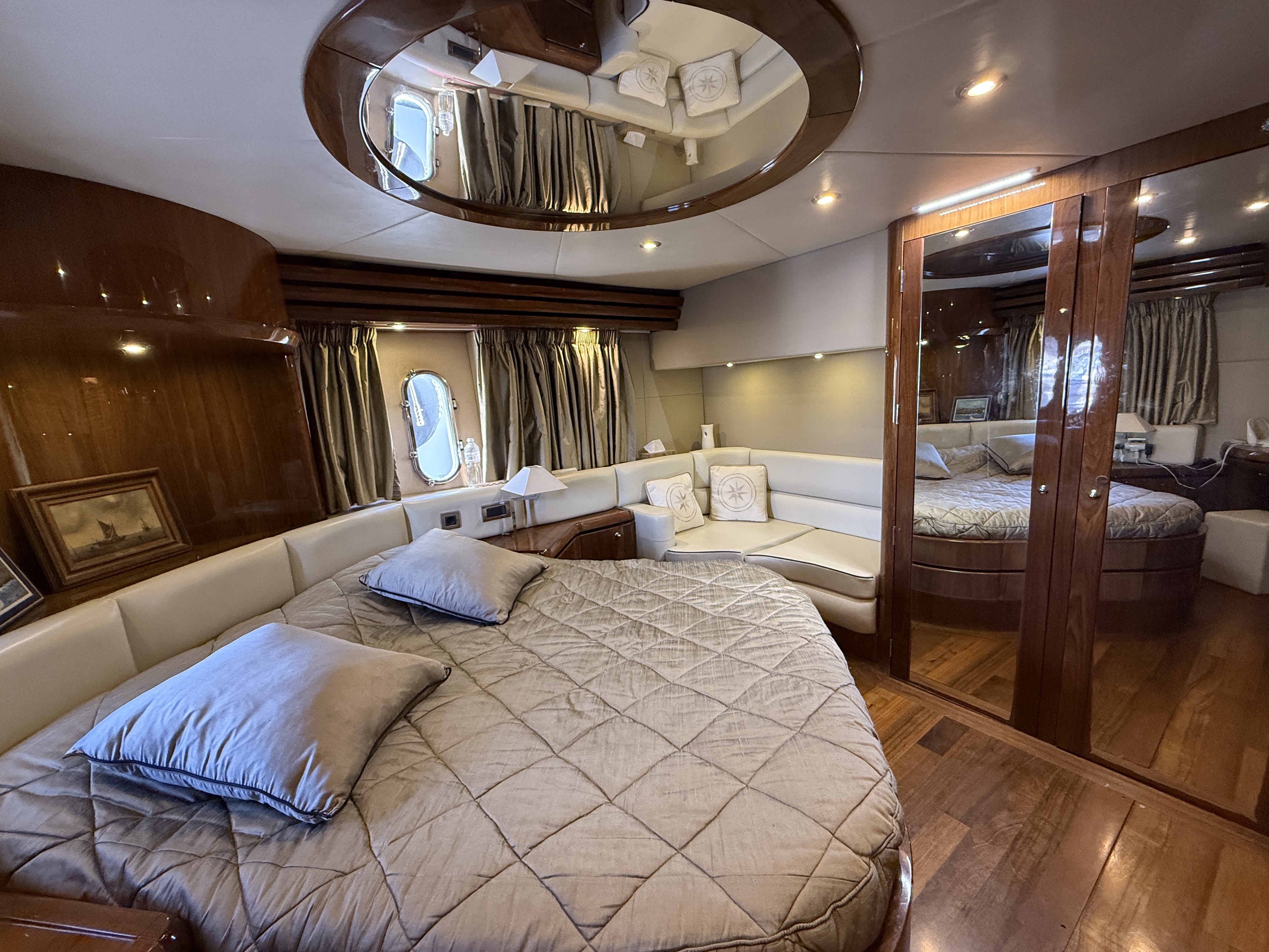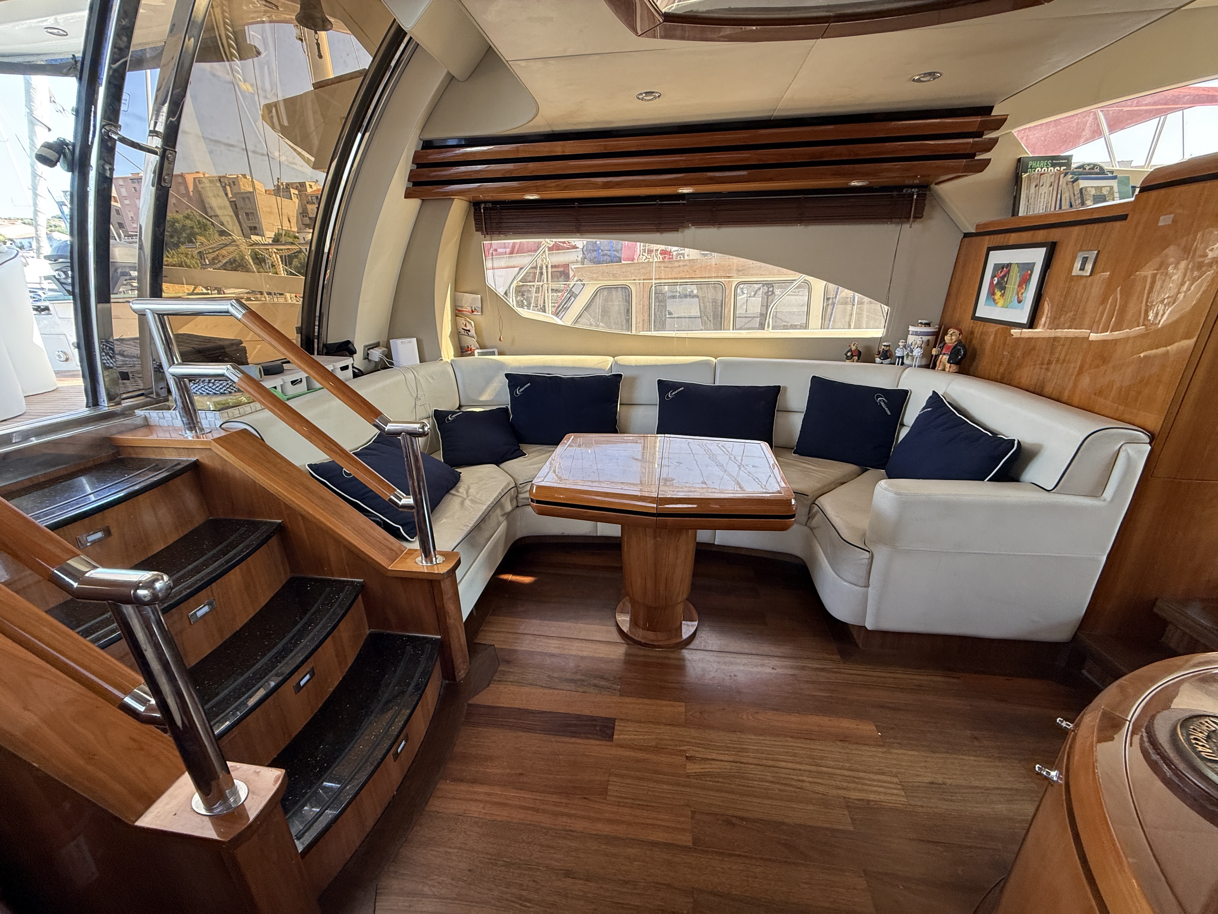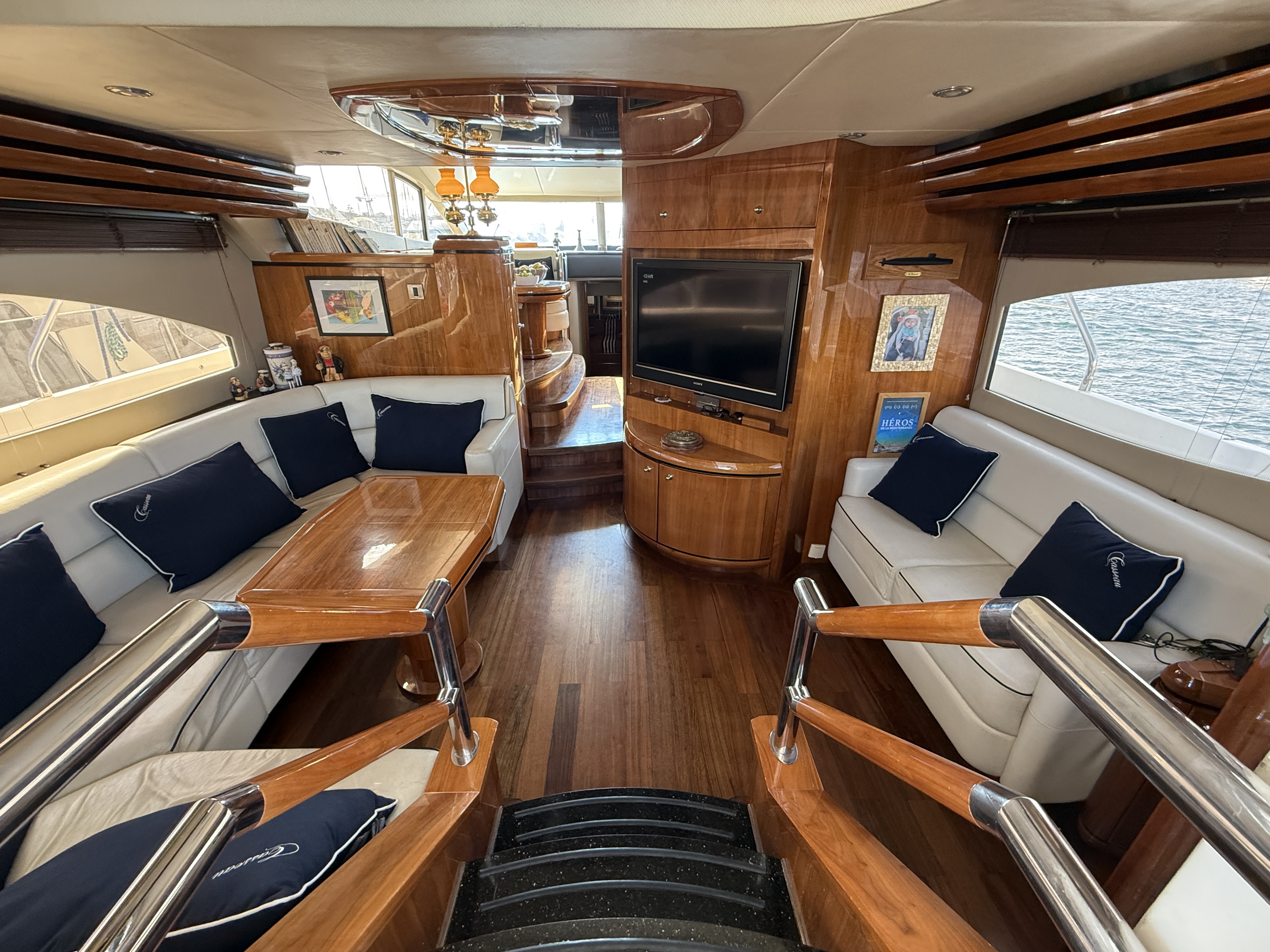 Exteriorly, the yacht offers a spacious flybridge with a dining area and sunbathing areas, a convivial aft deck protected by a large electric hardtop, and a hydraulic swim platform ideal for water sports.