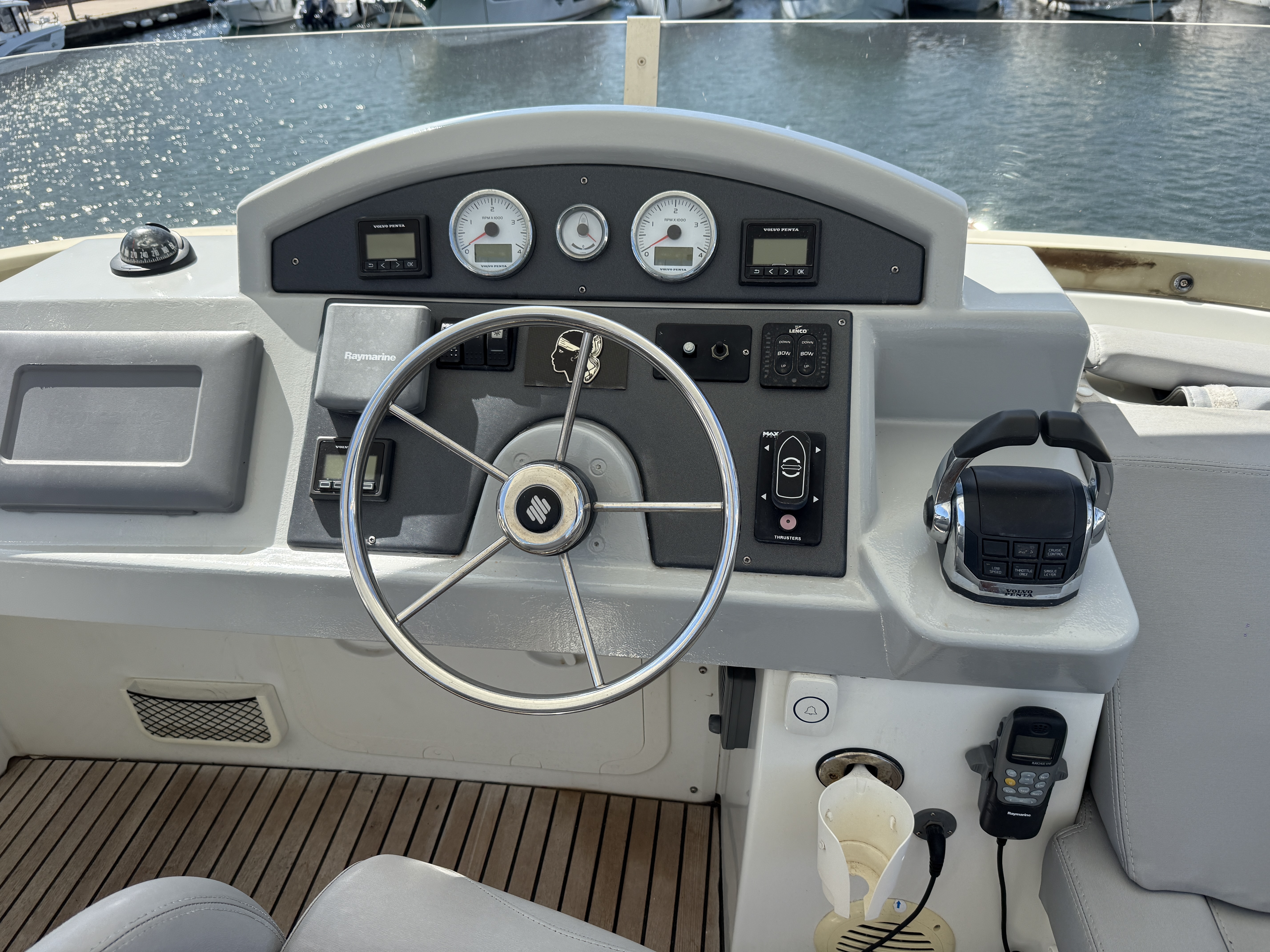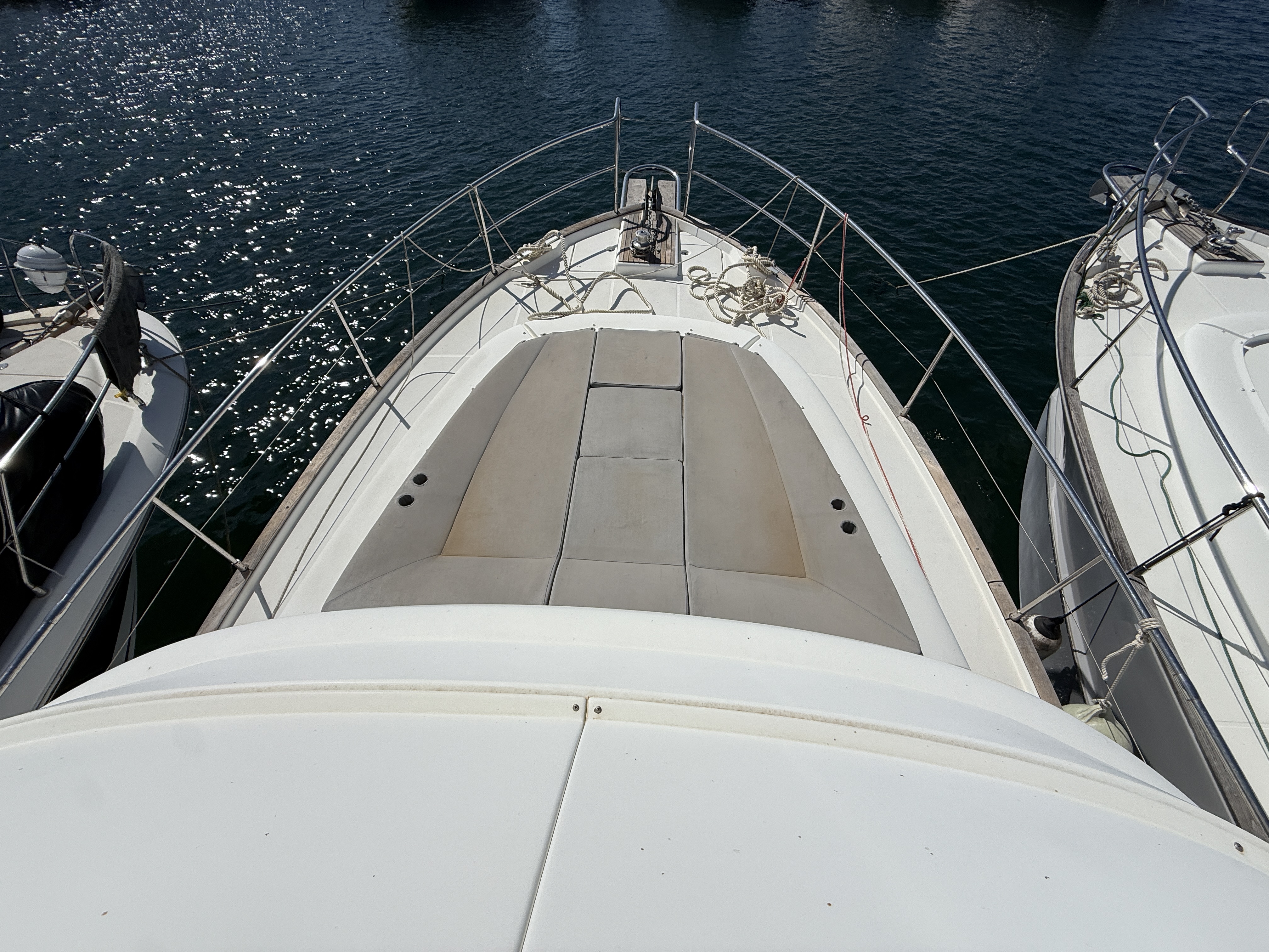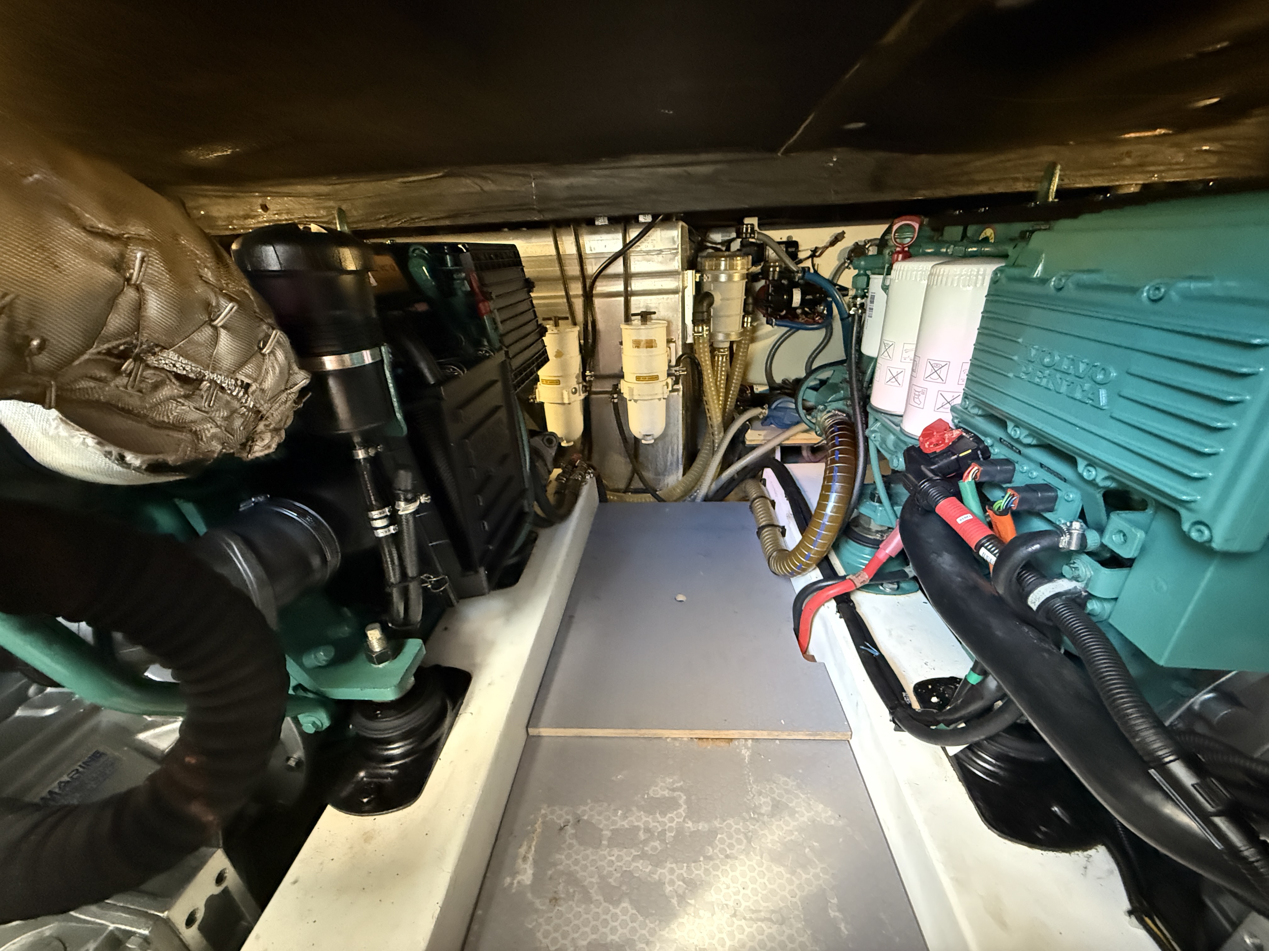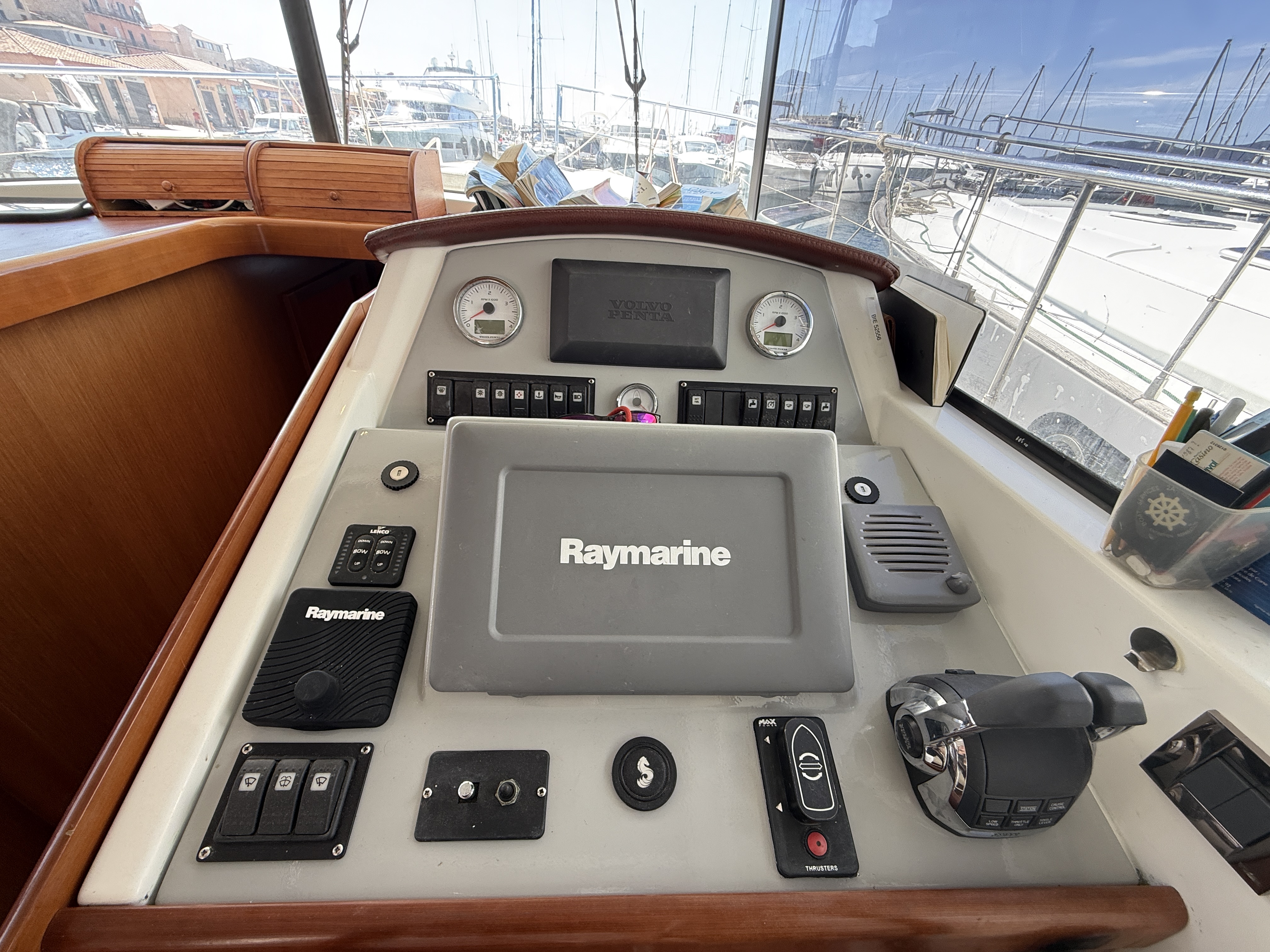 Powered by two 300 hp Volvo D4s, this Swift Trawler remains powerful, comfortable, and safe for cruising. Fully equipped, it features new electric controls (2023), bow and stern thrusters, electric trim tabs, recent batteries, a generator, inverters, as well as a hydraulic gangway and a crane on the flybridge for launching a tender. Its layout is designed for comfort: a rigid hardtop on the flybridge, aft teak platform, a winch on the flybridge, a grill, a refrigerator in the galley and on the flybridge, not to mention its electronic equipment: GPS, autopilot, depth sounder, speedometer, and VHF radio.
