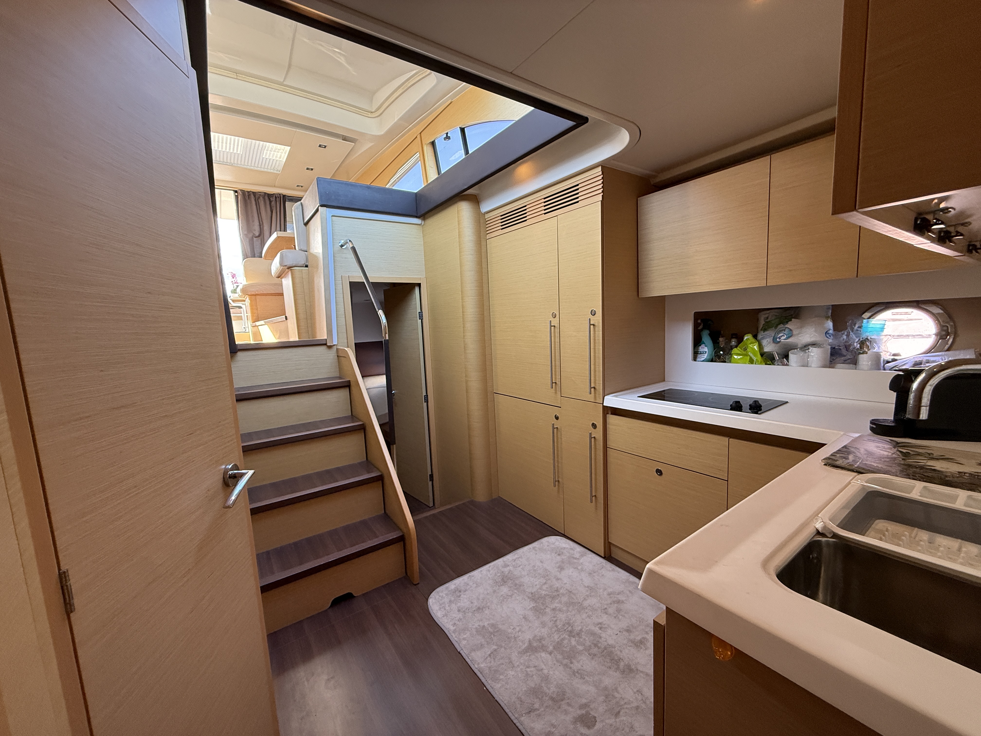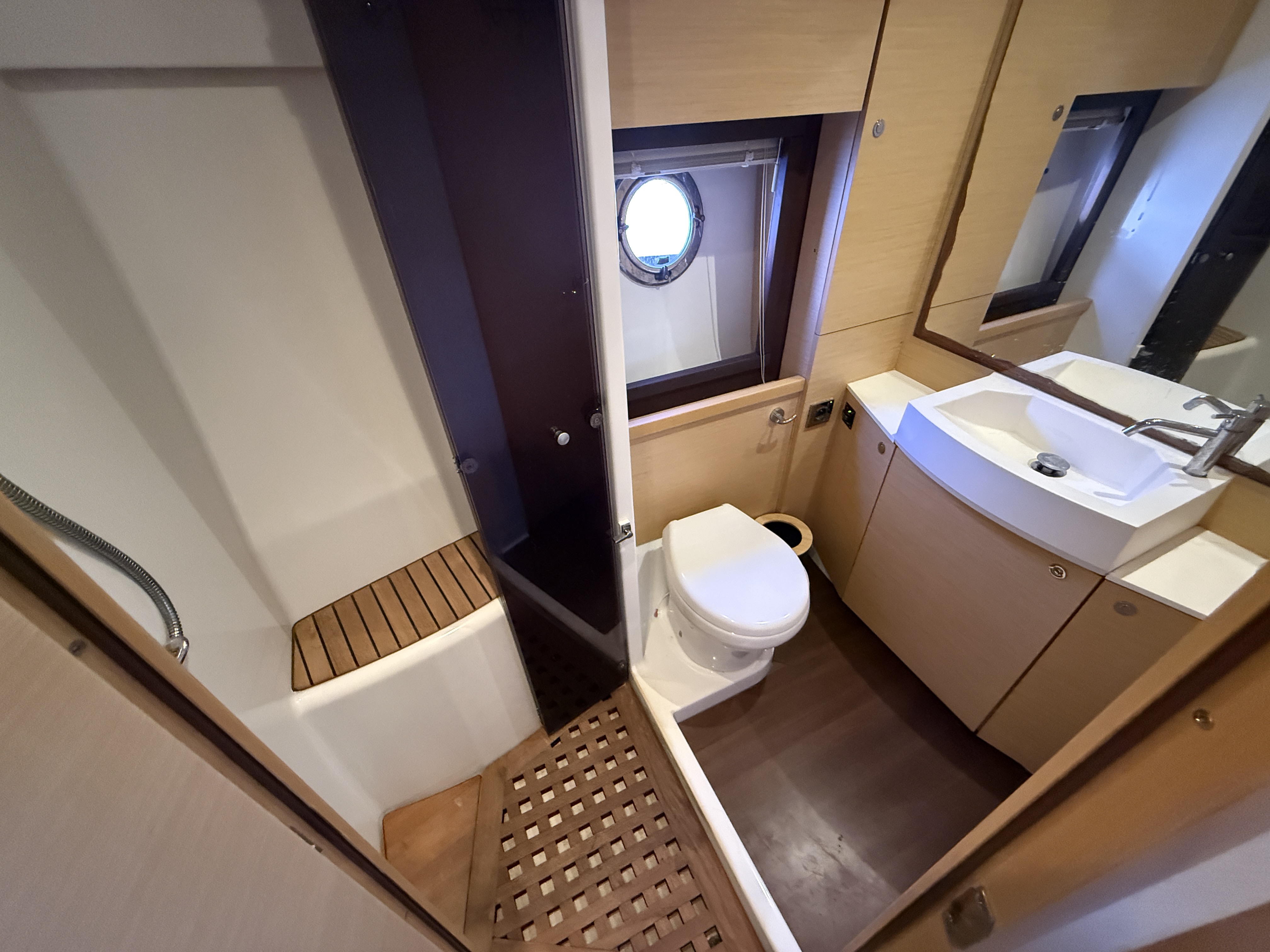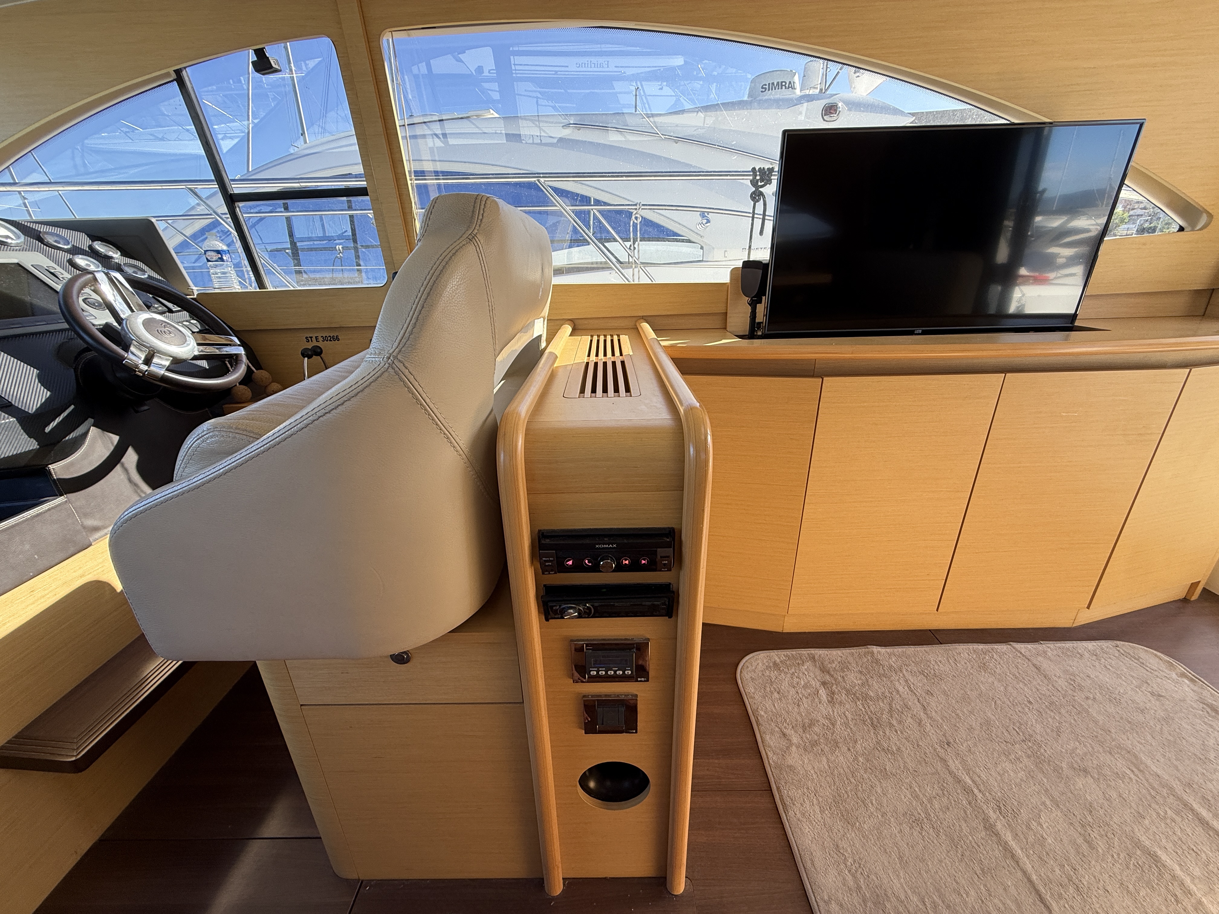 This boat is powered by two Volvo D4-435s and benefits from numerous recent equipment and €50,000 in invoices over the last three years: exhaust elbows replaced in 2024, new batteries, new upholstery in 2024, new Raymarine autopilot (2024), air conditioning replaced in 2024, and an electric windlass with a new engine.