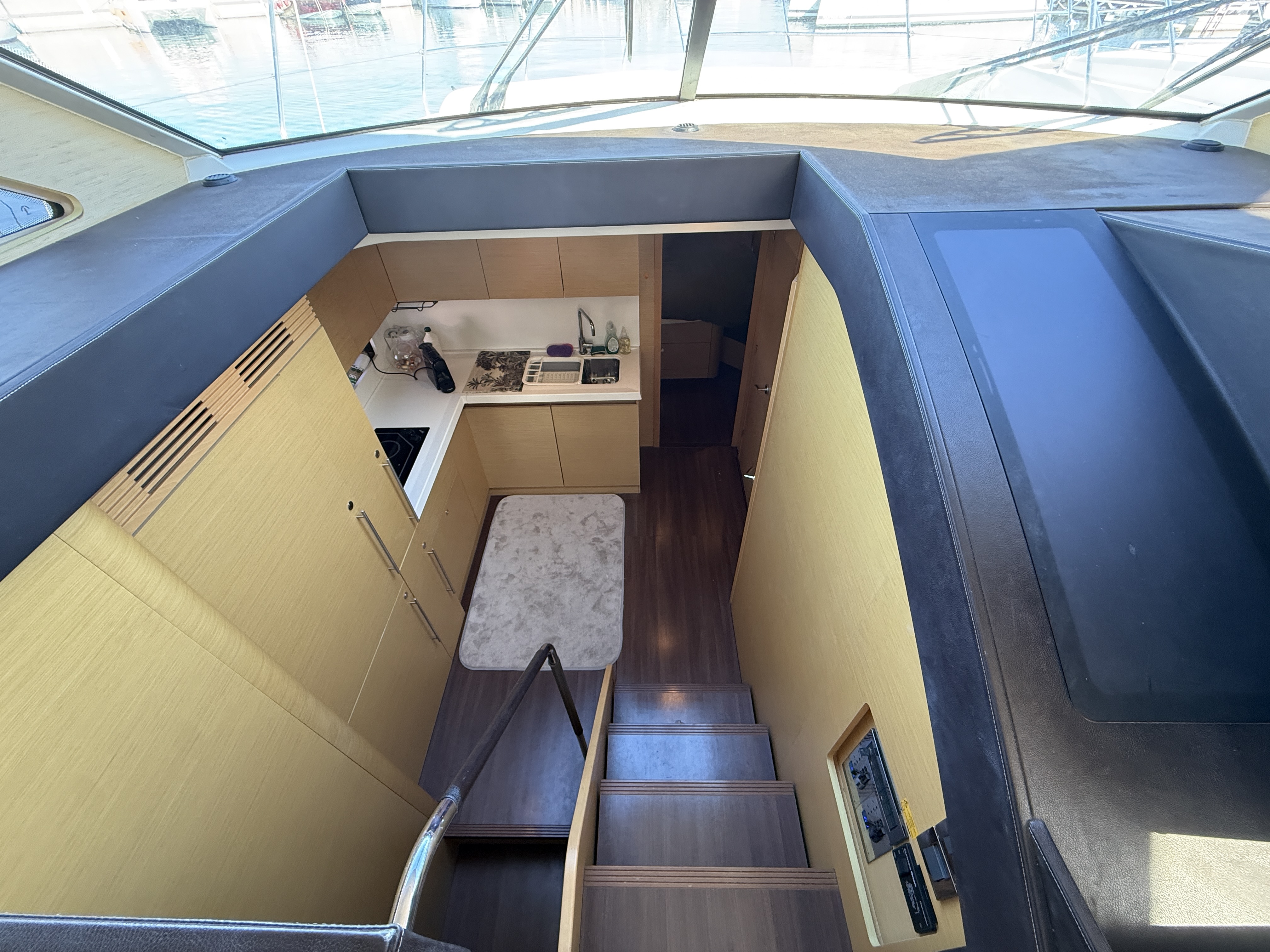 It also features an electric hardtop, an electric aft sun awning, a tender garage, a grill, Raymarine radar and VHF, and a chain counter.
