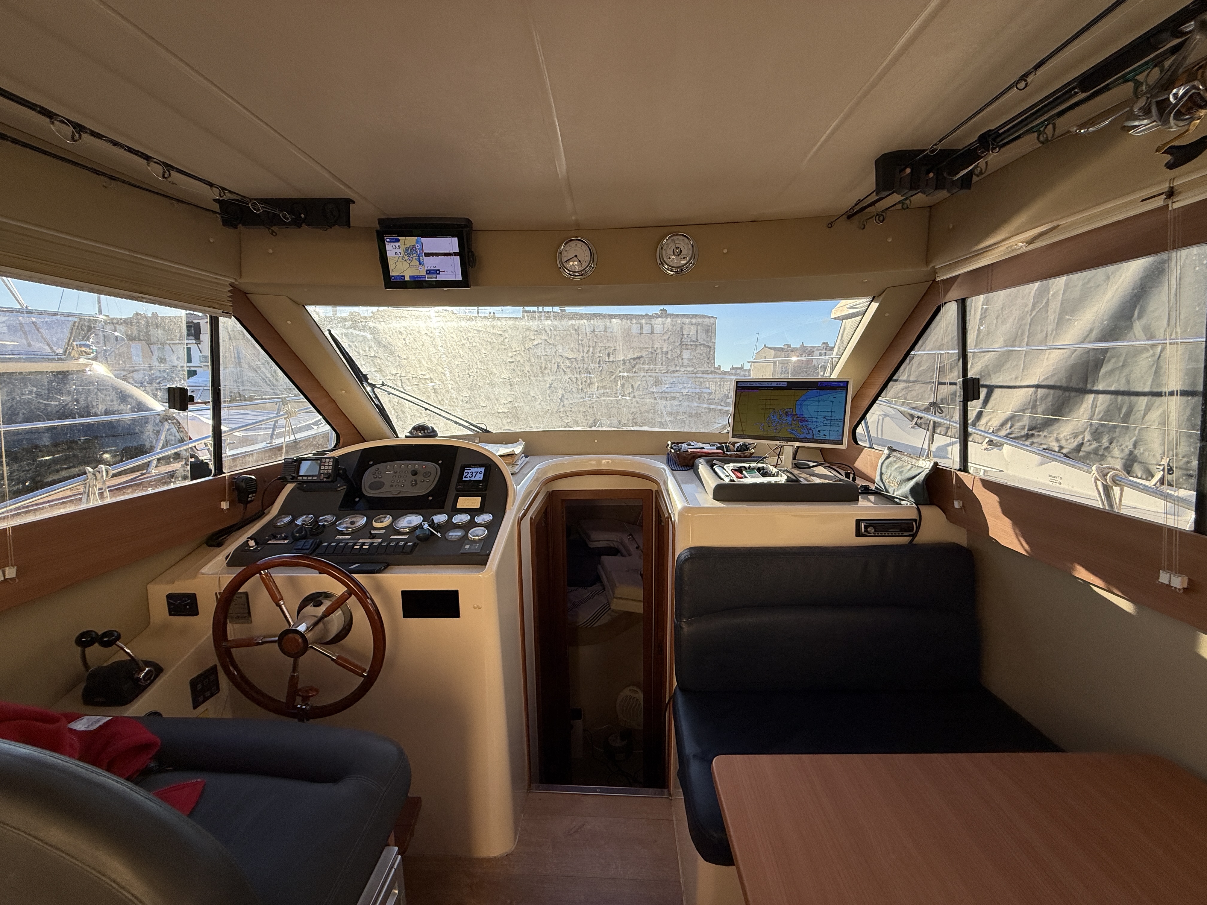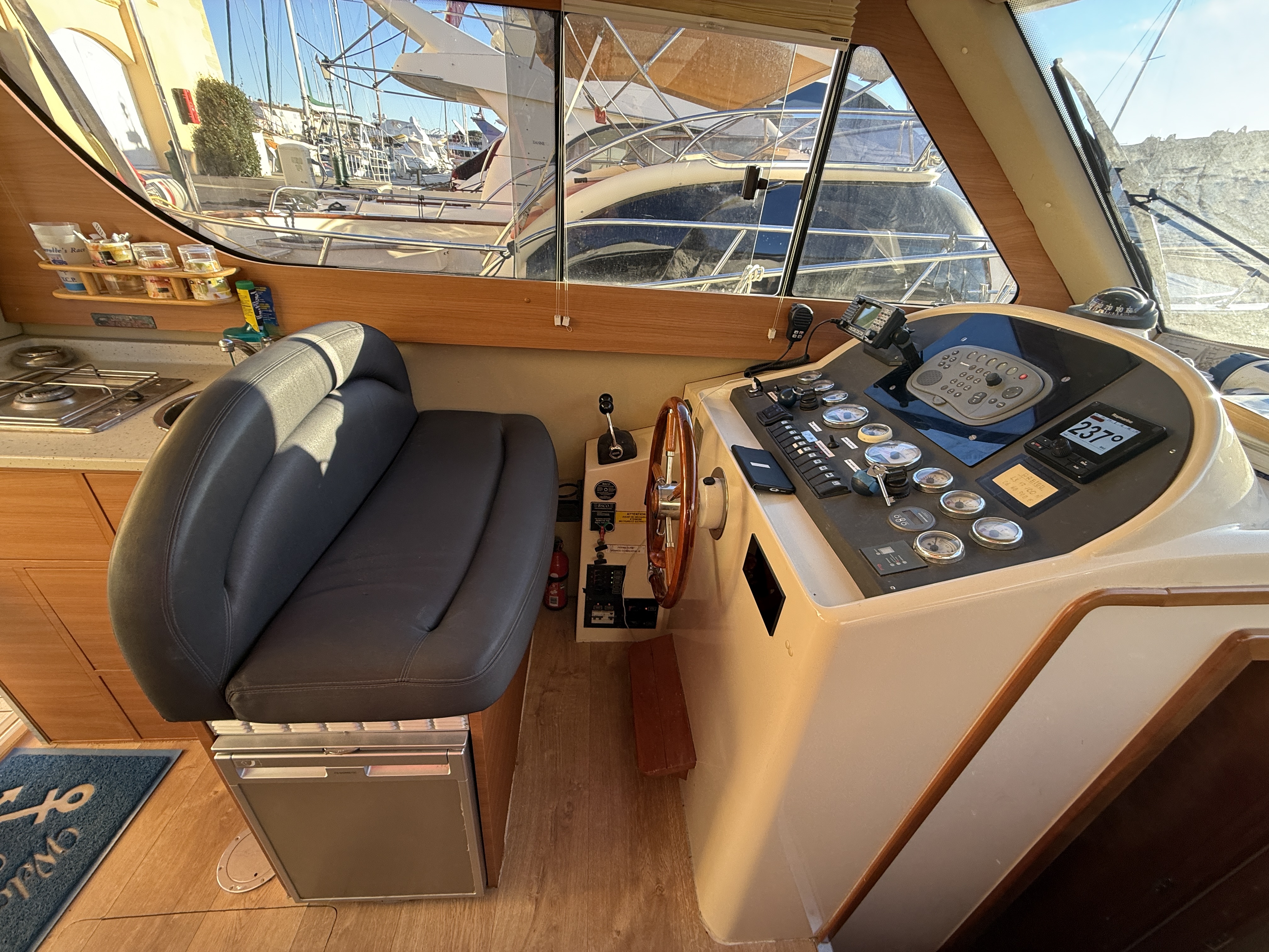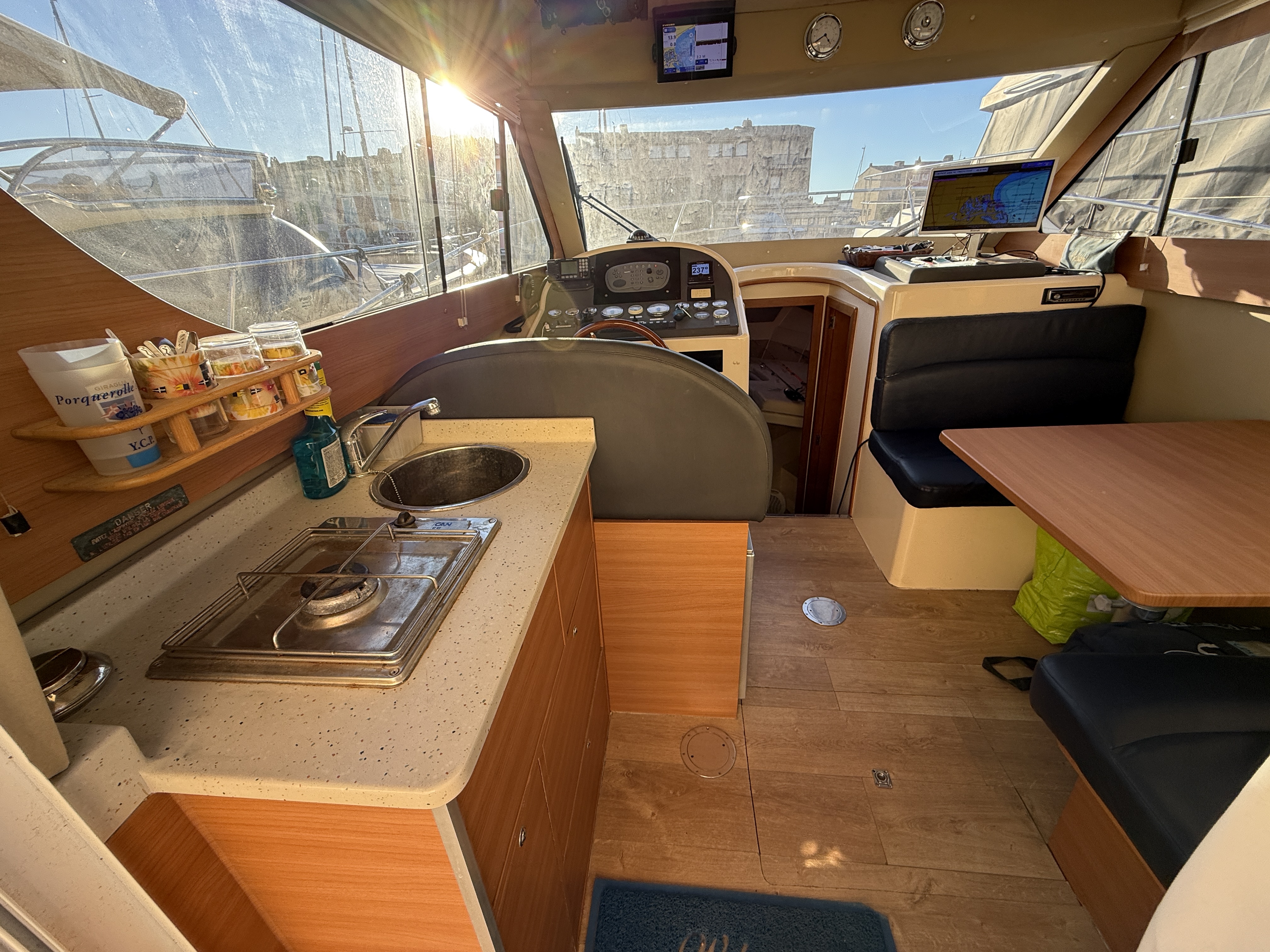 On board, two cabins, one head, a fully equipped galley, and additional berths offer exceptional comfort on a boat under 10 meters. The flybridge with bimini, sunbathing cushions, and complete electronics package (Raymarine / Furuno / 2022 VHF / Victron battery management system) make this boat ideal for cruising, family weekends, or fishing.