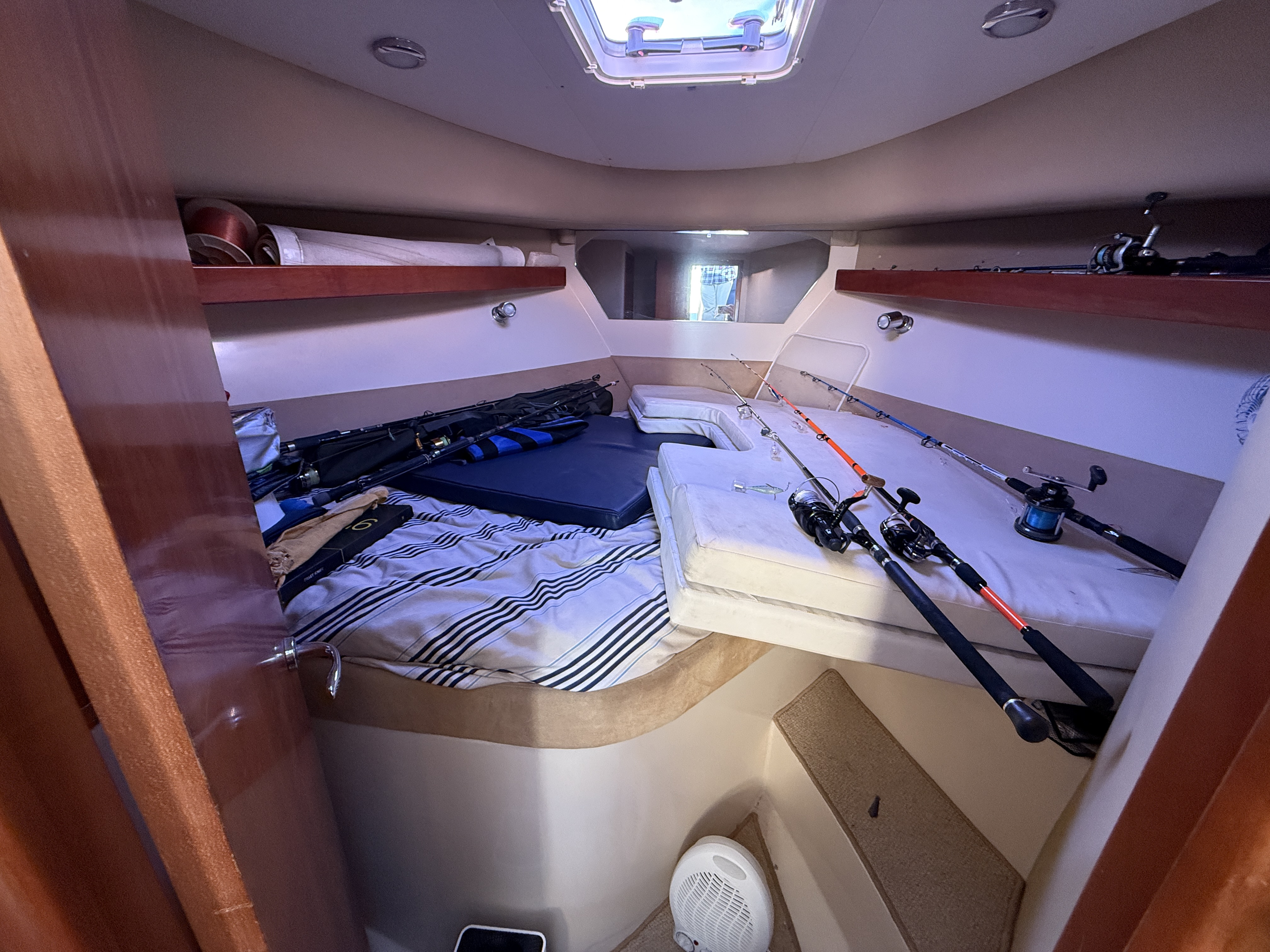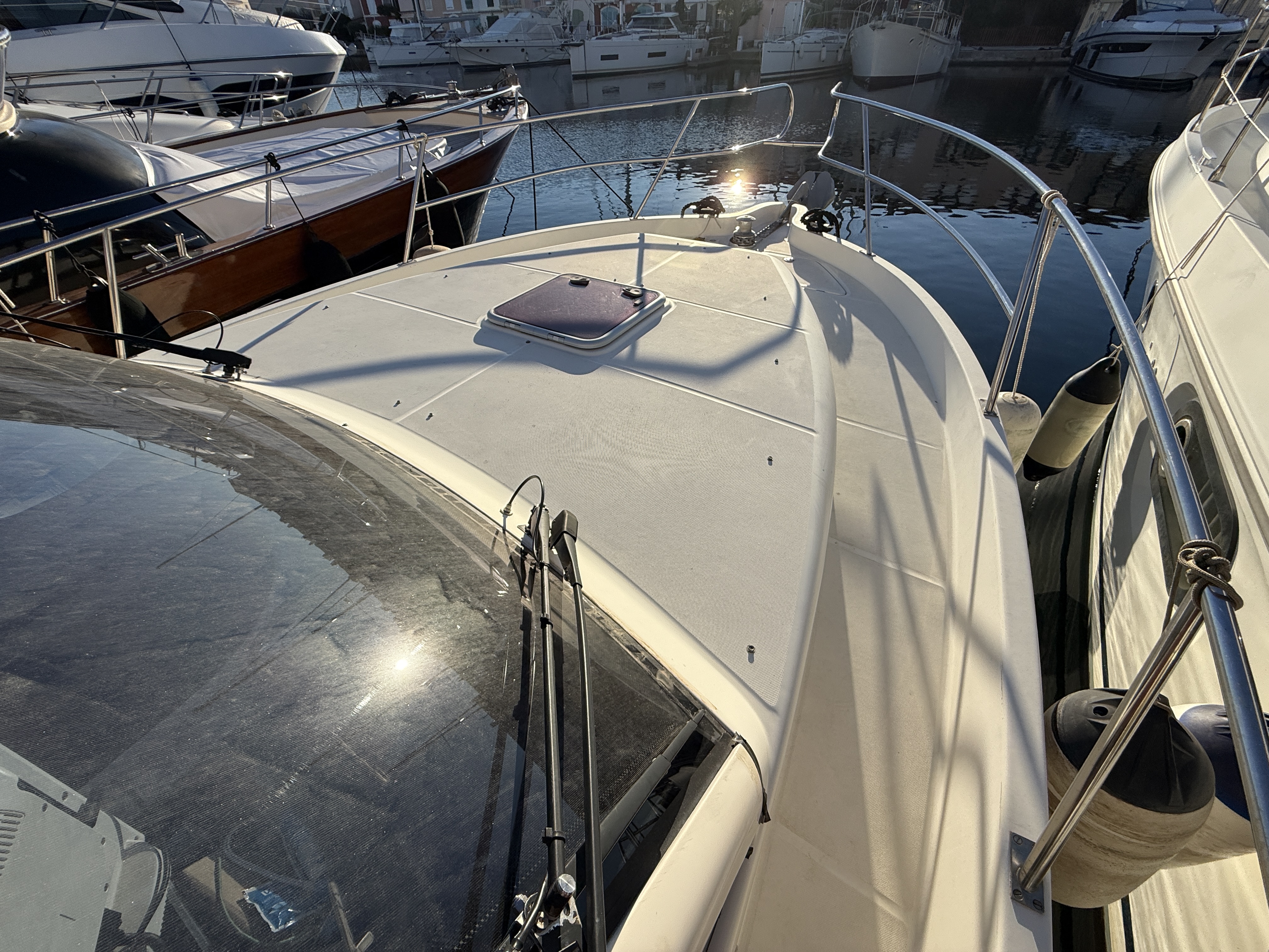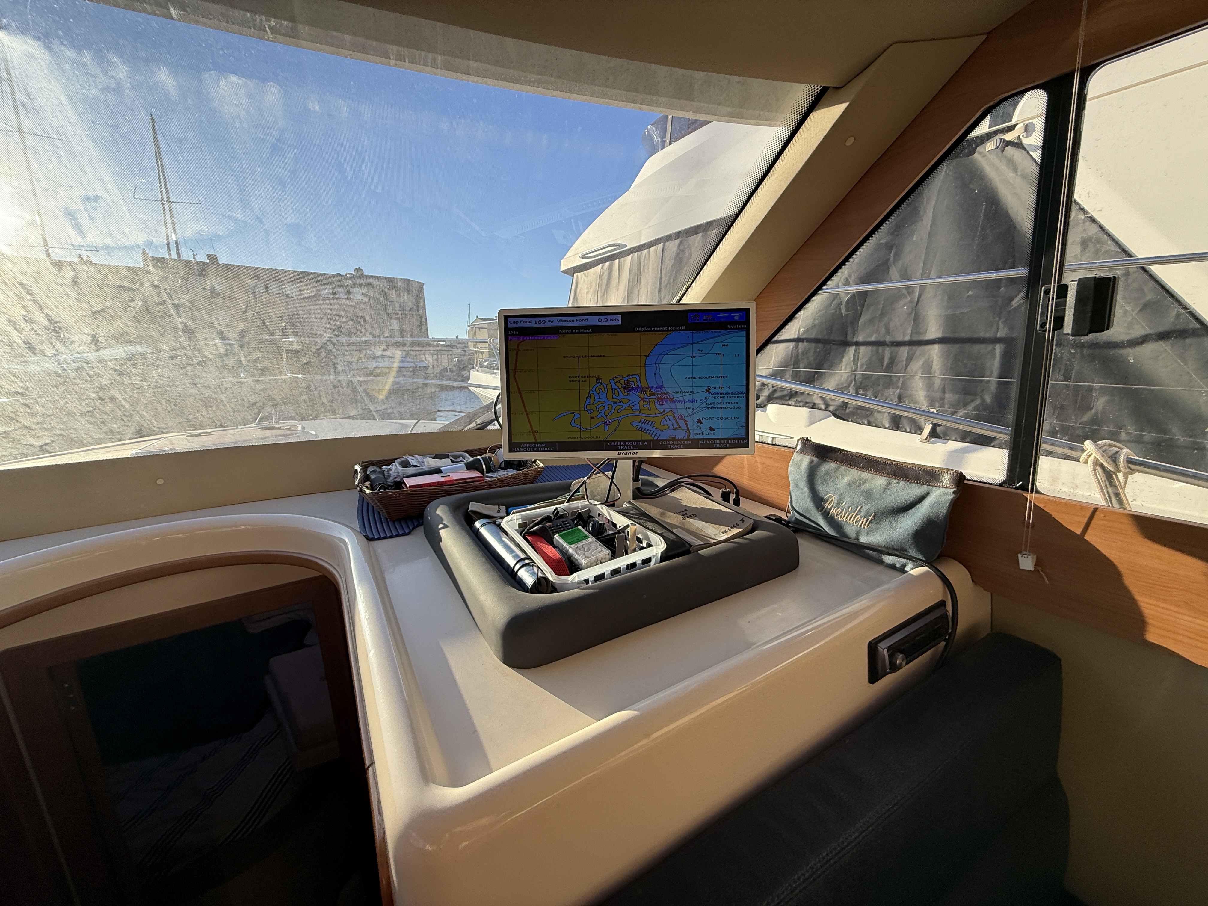 On board, two cabins, one head, a fully equipped galley, and additional berths offer exceptional comfort on a boat under 10 meters. The flybridge with bimini, sunbathing cushions, and complete electronics package (Raymarine / Furuno / 2022 VHF / Victron battery management system) make this boat ideal for cruising, family weekends, or fishing.