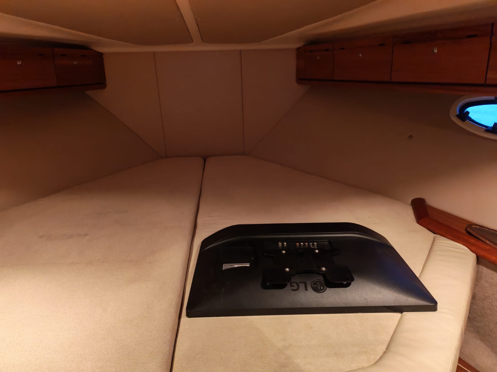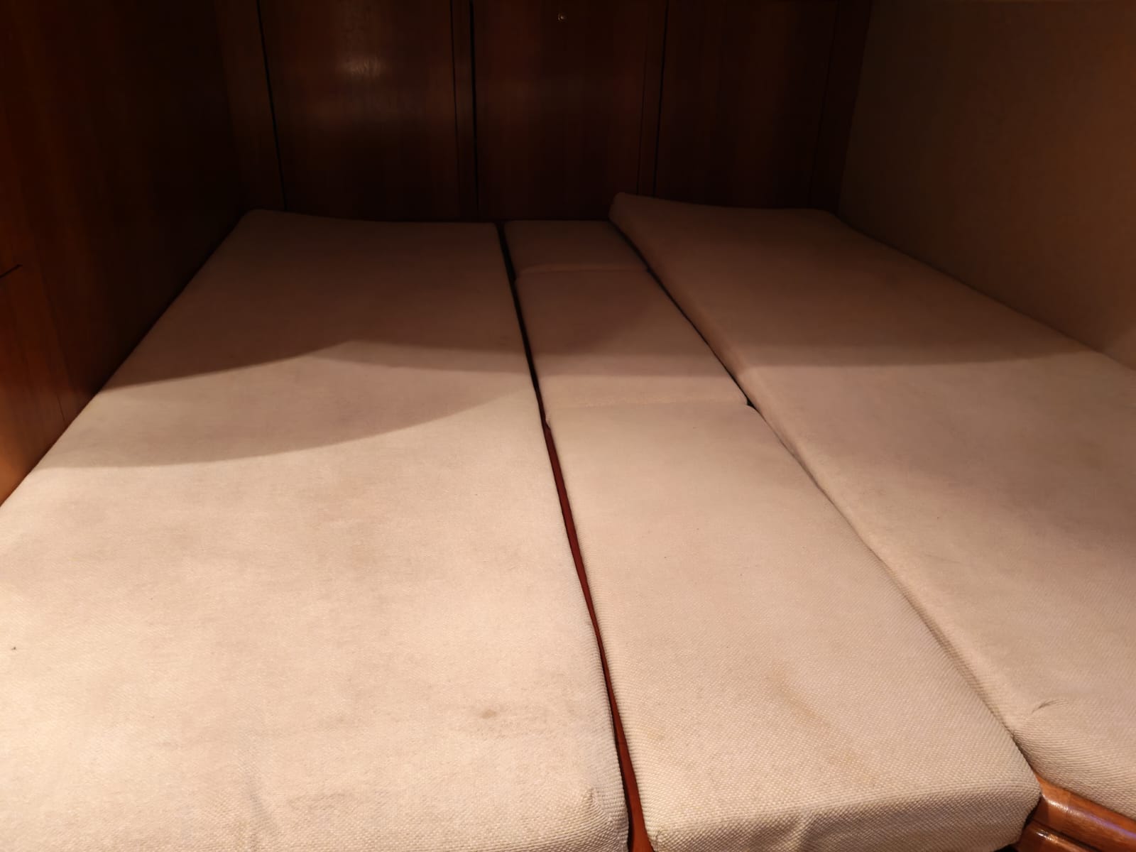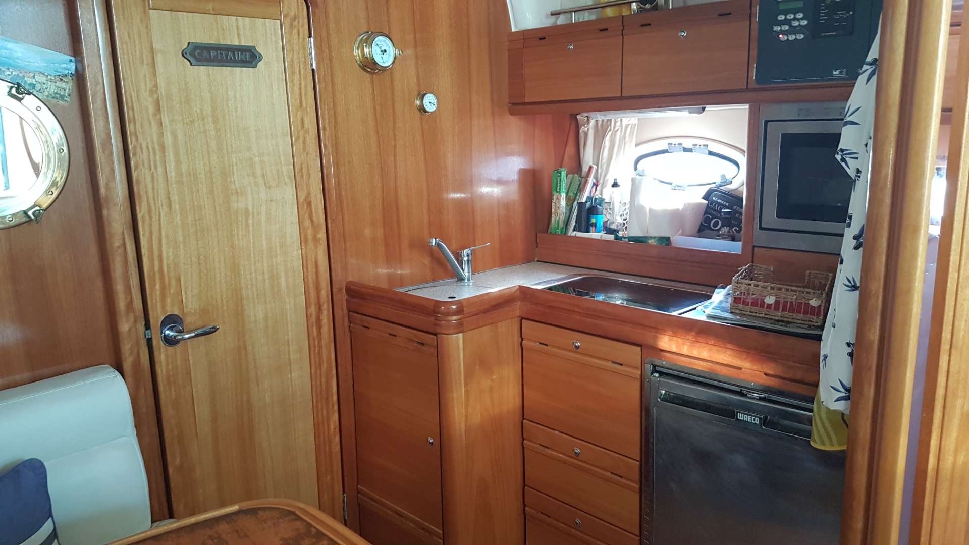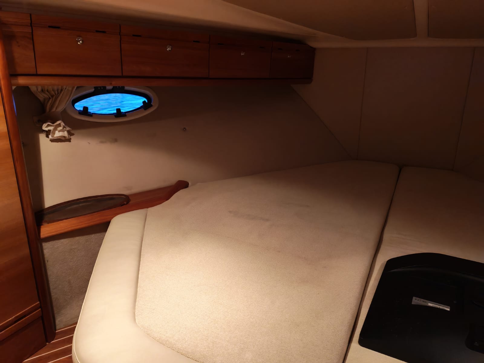 The interior offers considerable comfort for extended stays on board, thanks to reversible air conditioning, a TV, a modern Bluetooth radio, and a comfortable dining area. The galley is equipped with a gas hob, refrigerator, microwave, and ample storage. The head has an electric toilet and a separate shower. There are two cabins: an owner's cabin with storage and wardrobes, and a guest cabin that can be configured as a double bed or two single beds.